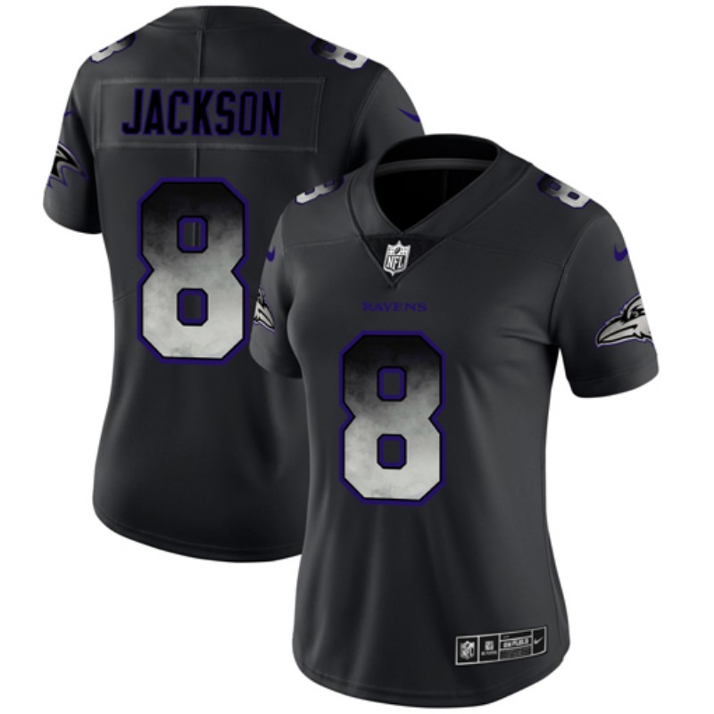 Women's Baltimore Ravens #8 Lamar Jackson Black 2019 Smoke Fashion Limited Stitched NFL Jersey(Run Small)