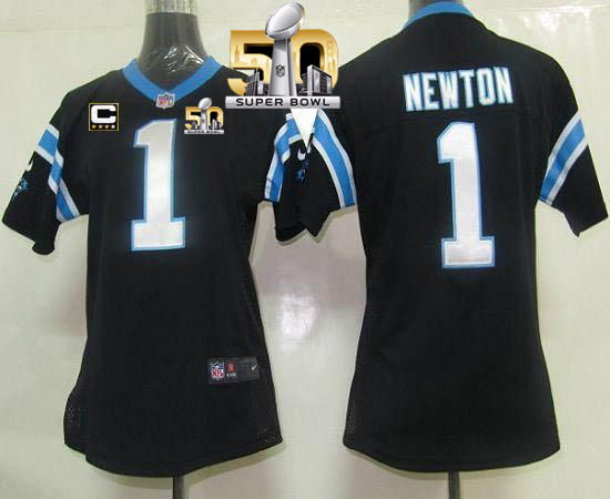 Nike Panthers #1 Cam Newton Black Team Color With C Patch Super Bowl 50 Women's Stitched NFL Elite Jersey