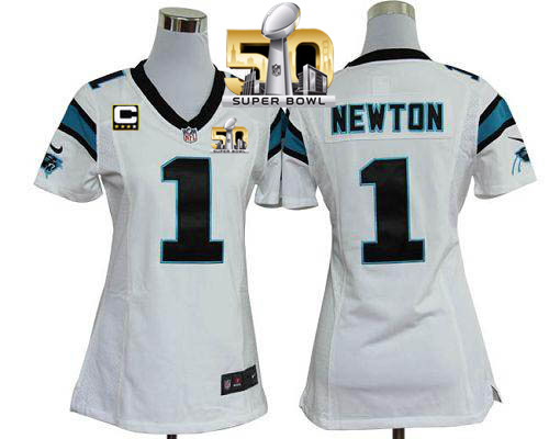 Nike Panthers #1 Cam Newton White With C Patch Super Bowl 50 Women's Stitched NFL Elite Jersey