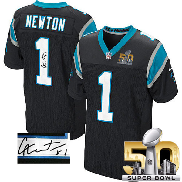 Nike Panthers #1 Cam Newton Black Team Color Super Bowl 50 Men's Stitched NFL Elite Autographed Jersey
