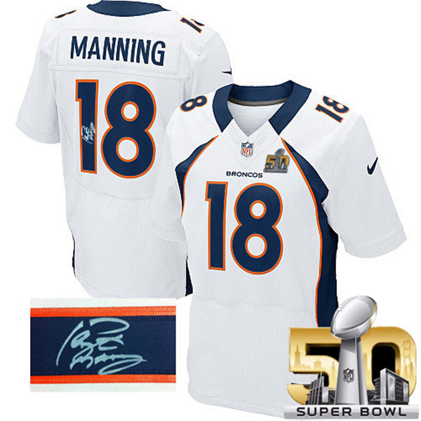 Nike Broncos #18 Peyton Manning White Super Bowl 50 Men's Stitched NFL Elite Autographed Jersey