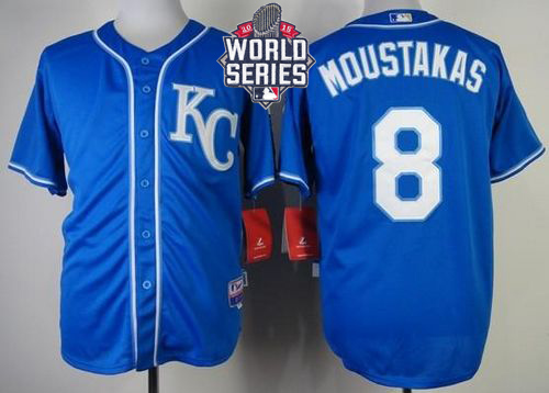 Royals #8 Mike Moustakas Blue Alternate 2 Cool Base W/2015 World Series Patch Stitched MLB Jersey
