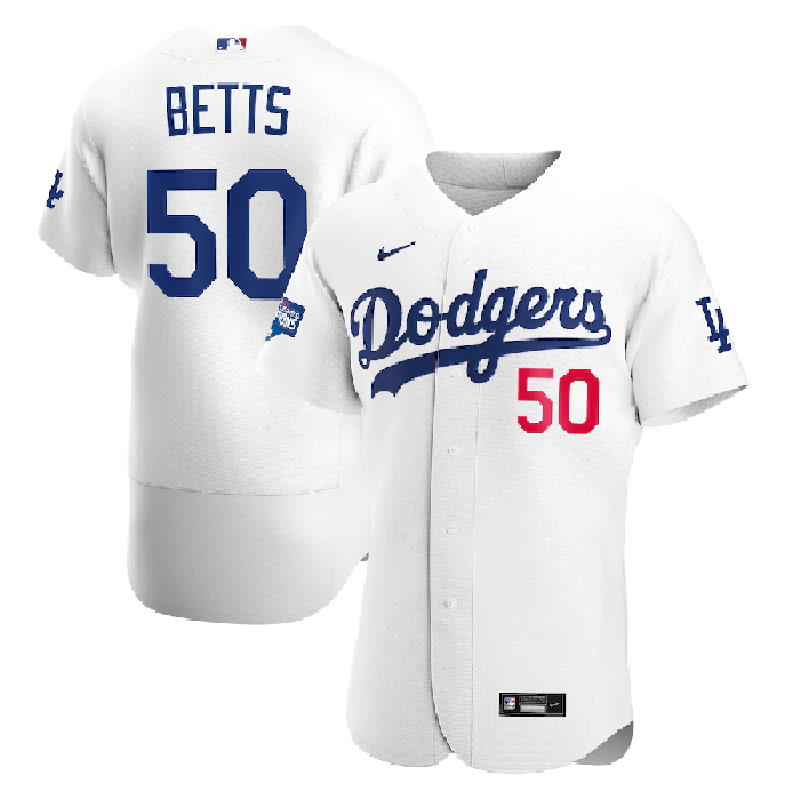 Men's Los Angeles Dodgers #50 Mookie Betts 2020 White World Series Champions Patch Flex Base Sttiched Jersey