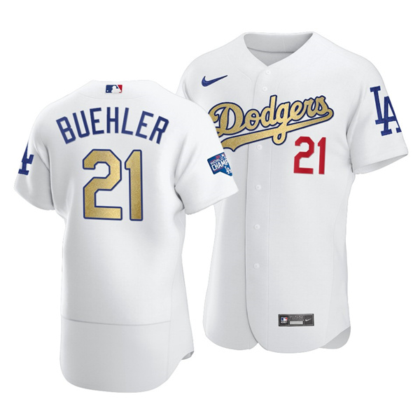 Men's Los Angeles Dodgers #21 Walker Buehler 2021 White Gold World Series Champions Patch Sttiched Jersey