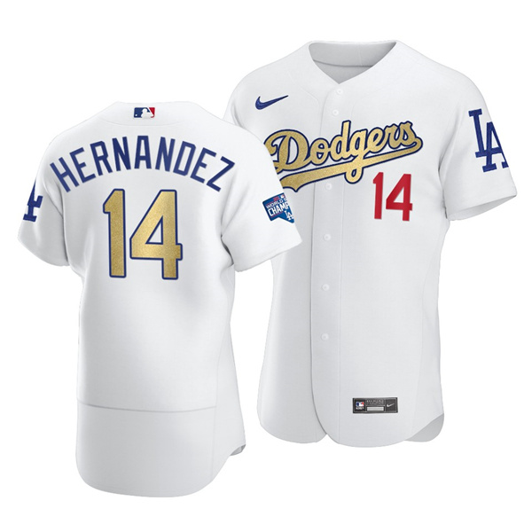 Men's Los Angeles Dodgers #14 Kiké Hernández 2021 White Gold World Series Champions Patch Sttiched Jersey