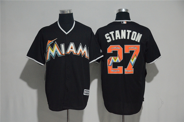 Men's Miami Marlins #27 Giancarlo Stanton Black Team Logo Print Cool Base Stitched MLB Jersey