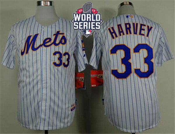 Mets #33 Matt Harvey White(Blue Strip) Home Cool Base W/2015 World Series Patch Stitched MLB Jersey