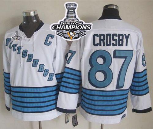 Penguins #87 Sidney Crosby White/Light Blue CCM Throwback 2016 Stanley Cup Champions Stitched NHL Jersey