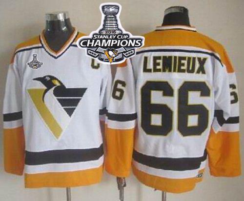 Penguins #66 Mario Lemieux White/Black CCM Throwback 2016 Stanley Cup Champions Stitched NHL Jersey