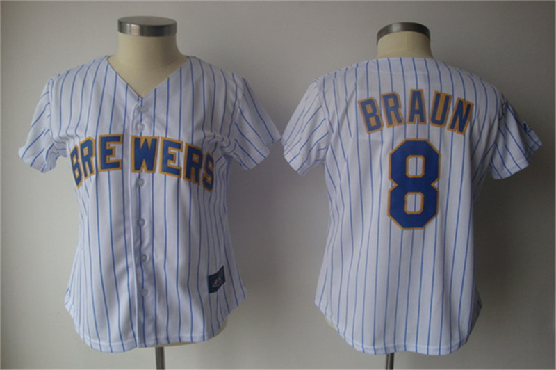 Brewers #8 Ryan Braun White With Blue Strip Lady Fashion Stitched MLB Jersey