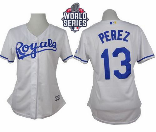 Royals #13 Salvador Perez White Home W/2015 World Series Patch Women's Stitched MLB Jersey