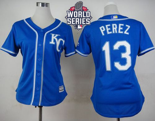 Royals #13 Salvador Perez Light Blue Alternate 1 W/2015 World Series Patch Women's Stitched MLB Jersey