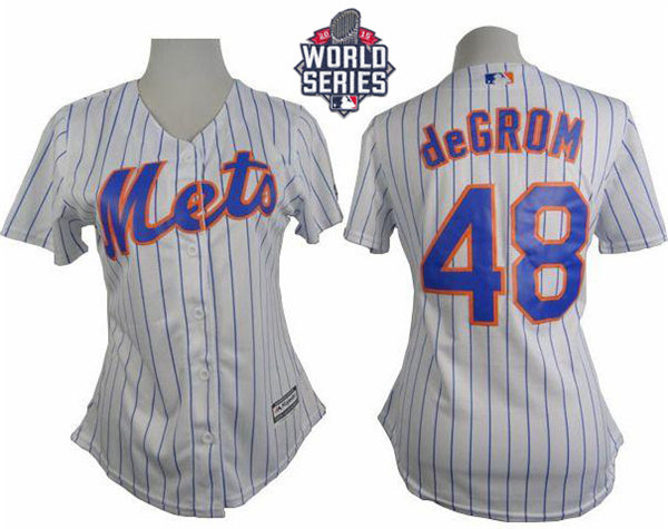 Mets #48 Jacob deGrom White(Blue Strip) W/2015 World Series Patch Women's Home Stitched MLB Jersey