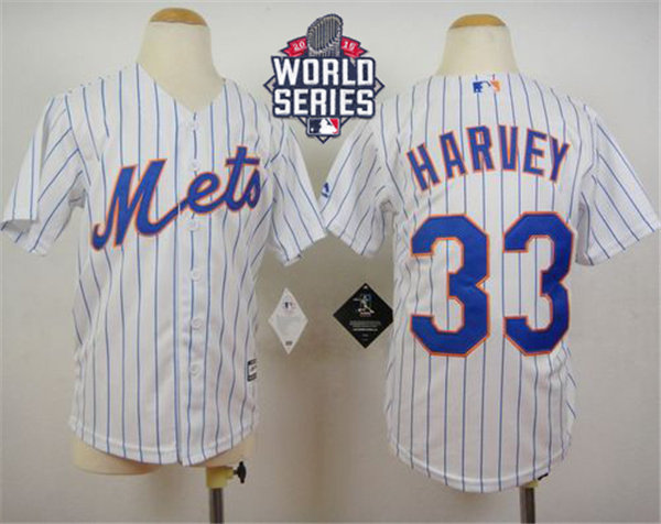 Mets #33 Matt Harvey White(Blue Strip) Home Cool Base W/2015 World Series Patch Stitched Youth MLB Jersey