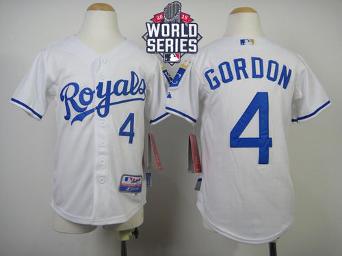 Royals #4 Alex Gordon White Cool Base W/2015 World Series Patch Stitched Youth MLB Jersey