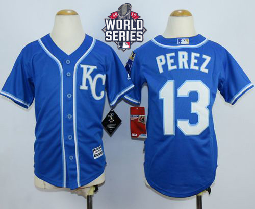 Royals #13 Salvador Perez Blue Cool Base W/2015 World Series Patch Stitched Youth MLB Jersey