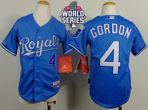 Royals #4 Alex Gordon Light Blue Cool Base Alternate 1 W/2015 World Series Patch Stitched Youth MLB Jersey