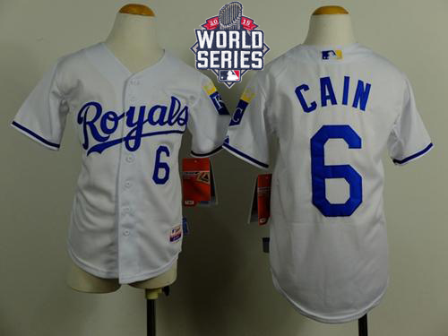 Royals #6 Lorenzo Cain White Cool Base W/2015 World Series Patch Stitched Youth MLB Jersey