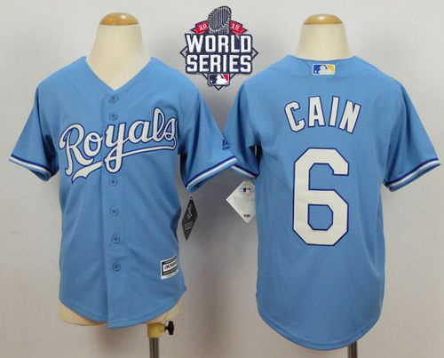 Royals #6 Lorenzo Cain Blue Alternate 2 Cool Base W/2015 World Series Patch Stitched Youth MLB Jersey