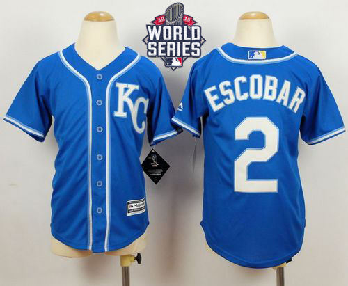 Royals #2 Alcides Escobar Blue Alternate 2 Cool Base W/2015 World Series Patch Stitched Youth MLB Jersey