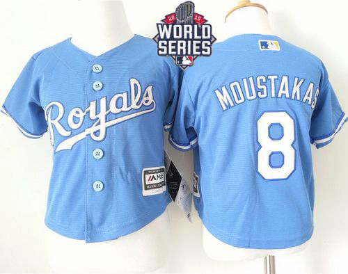Toddler Royals #8 Mike Moustakas Light Blue Alternate 1 Cool Base W/2015 World Series Patch Stitched MLB Jersey