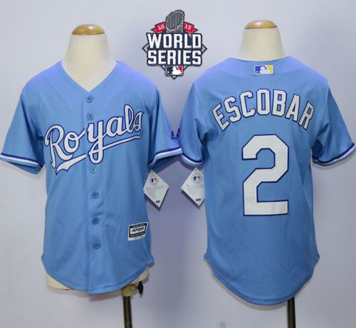Royals #2 Alcides Escobar Light Blue Alternate 1 Cool Base W/2015 World Series Patch Stitched Youth MLB Jersey