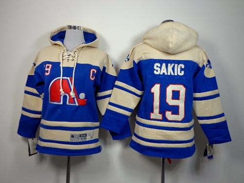 Nordiques #19 Joe Sakic Blue Sawyer Hooded Sweatshirt Stitched Youth NHL Jersey