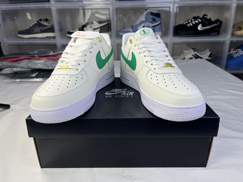 Sail leather uppers and a white sole unit provide anchor points for this pair, followed by plenty of malachite green to punctuate the shoes. Leather heel and plaid overlay, mini Swooshes on the front shoe, mid-sole paint and special "1" brand tongue tags are all embellished in nominal hues.