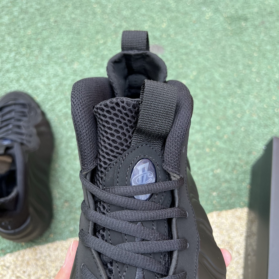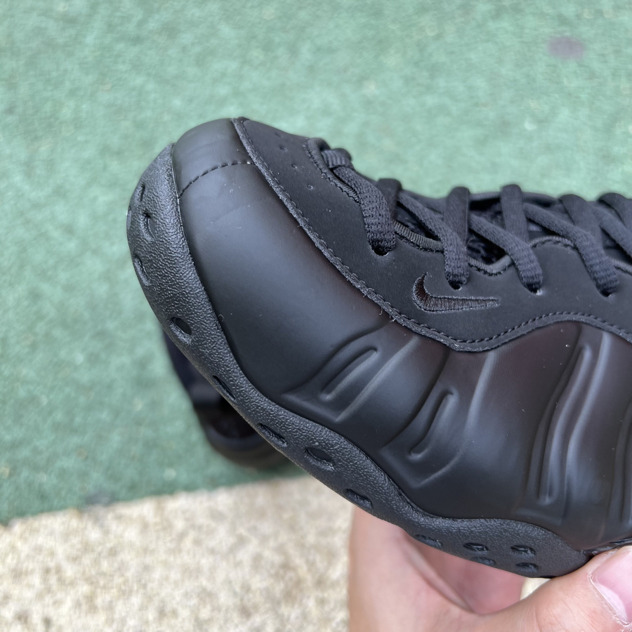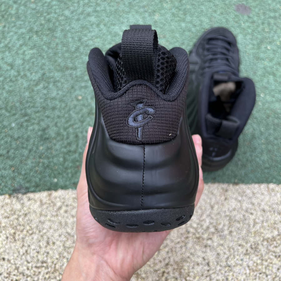 This Nike Air Foamposite One is dressed in a black and anthracite color combination. Similar to the 2007 model, it will feature Black Foamposite shells, black suede on the temples, and a mini Swoosh toe with anthracite. Other details include a "1 Cent" logo on the heel and a black rubber outsole.