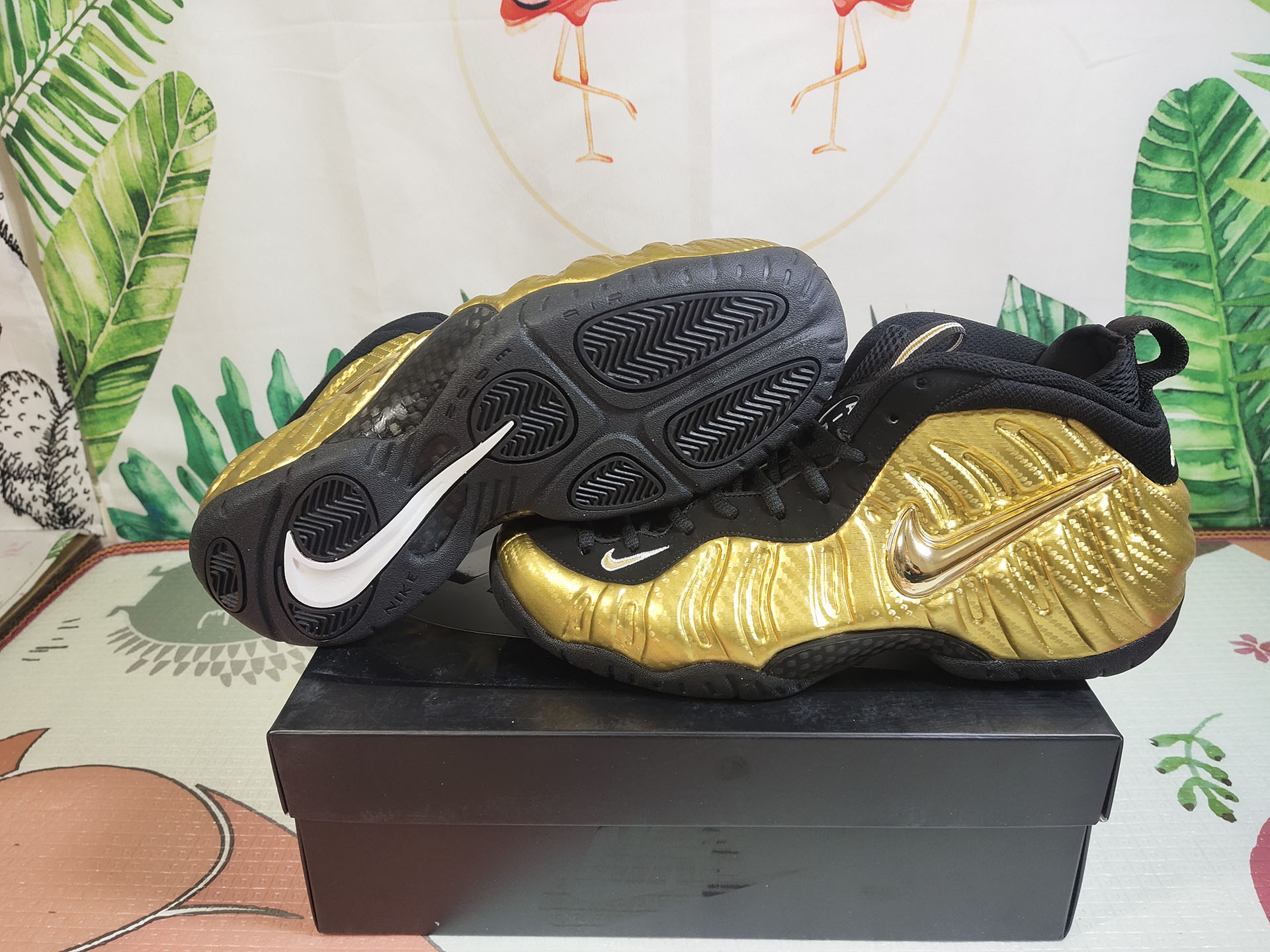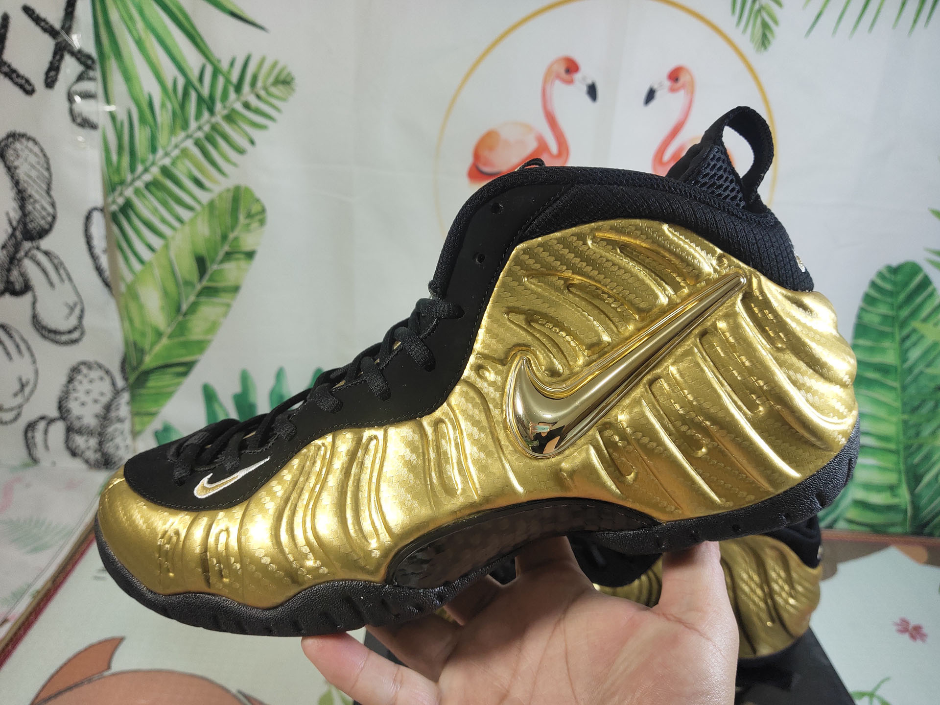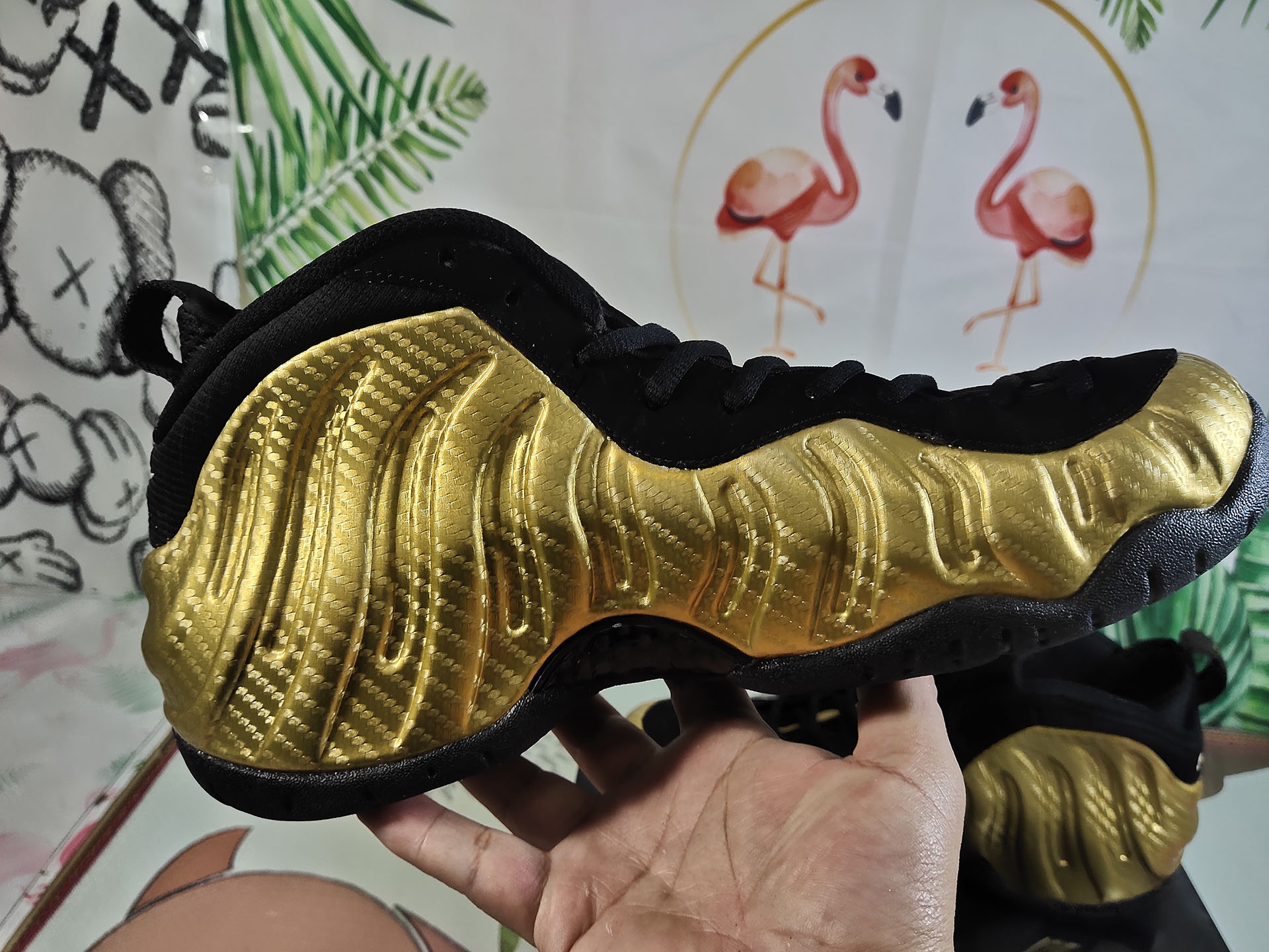 This Nike Air Foamposite Pro features a full Metallic Gold carbon fiber-like Foam shell. Complimenting the Gold is Black detailing on the upper, carbon fiber mid-foot plate and rubber sole.