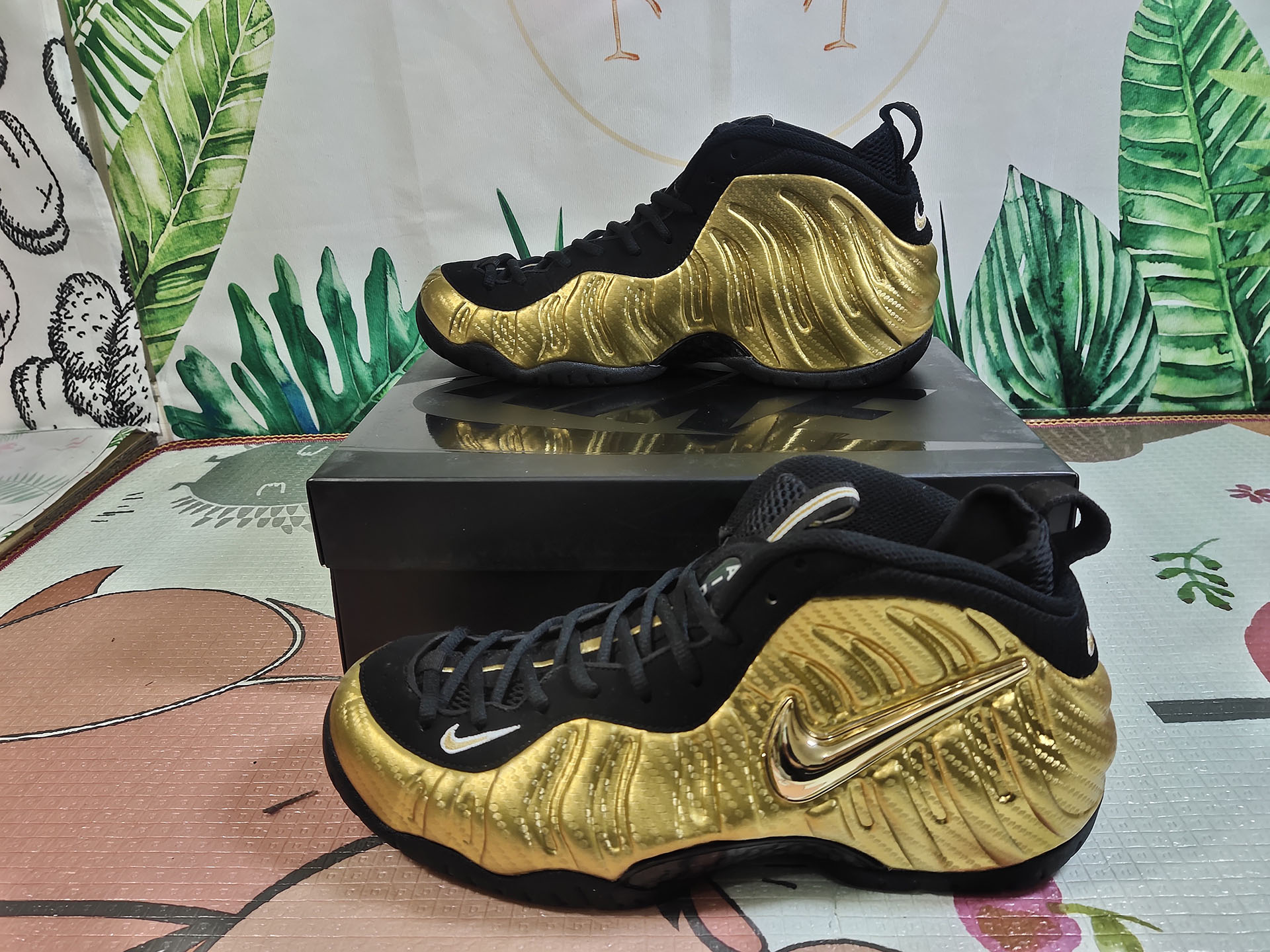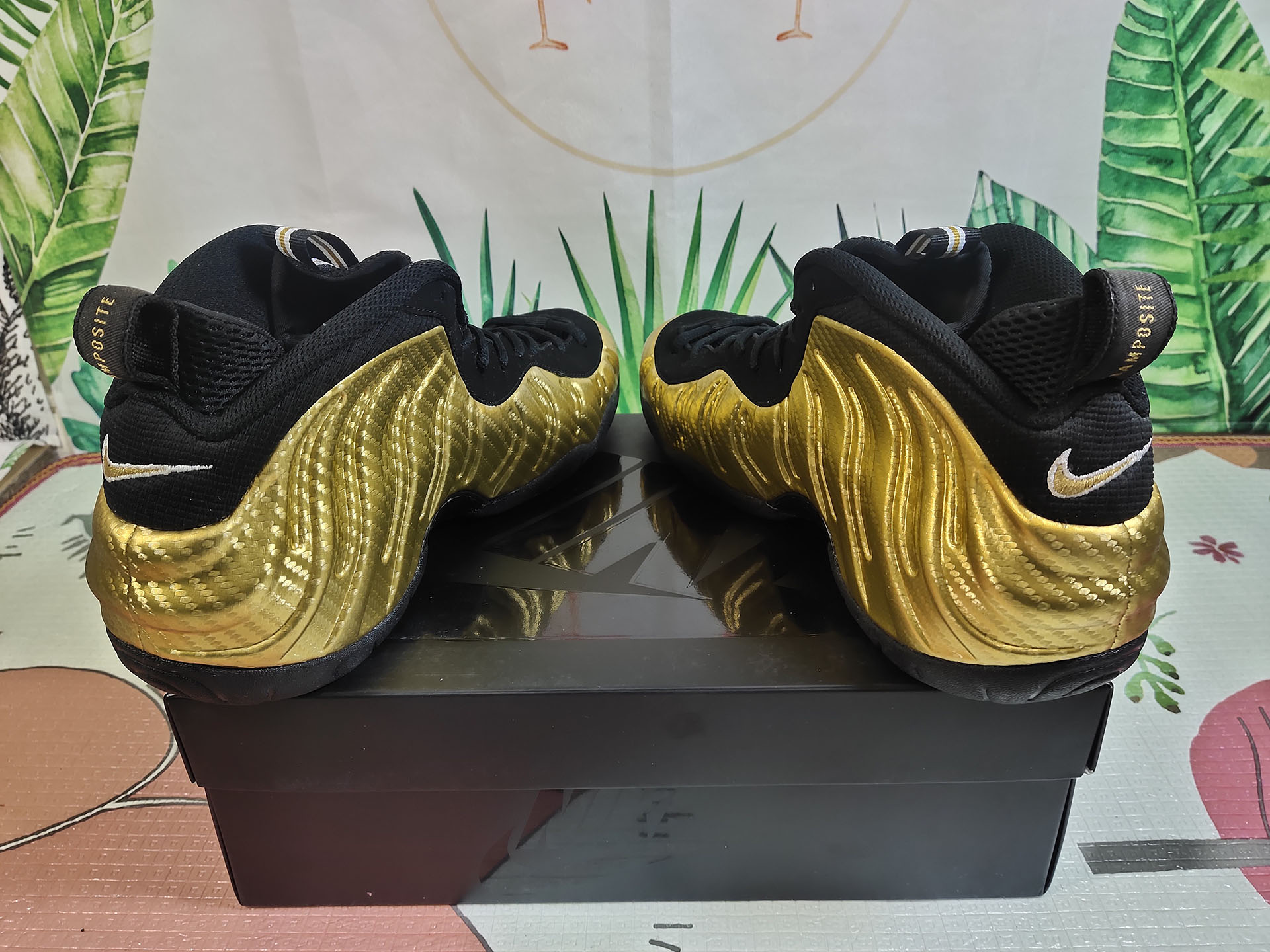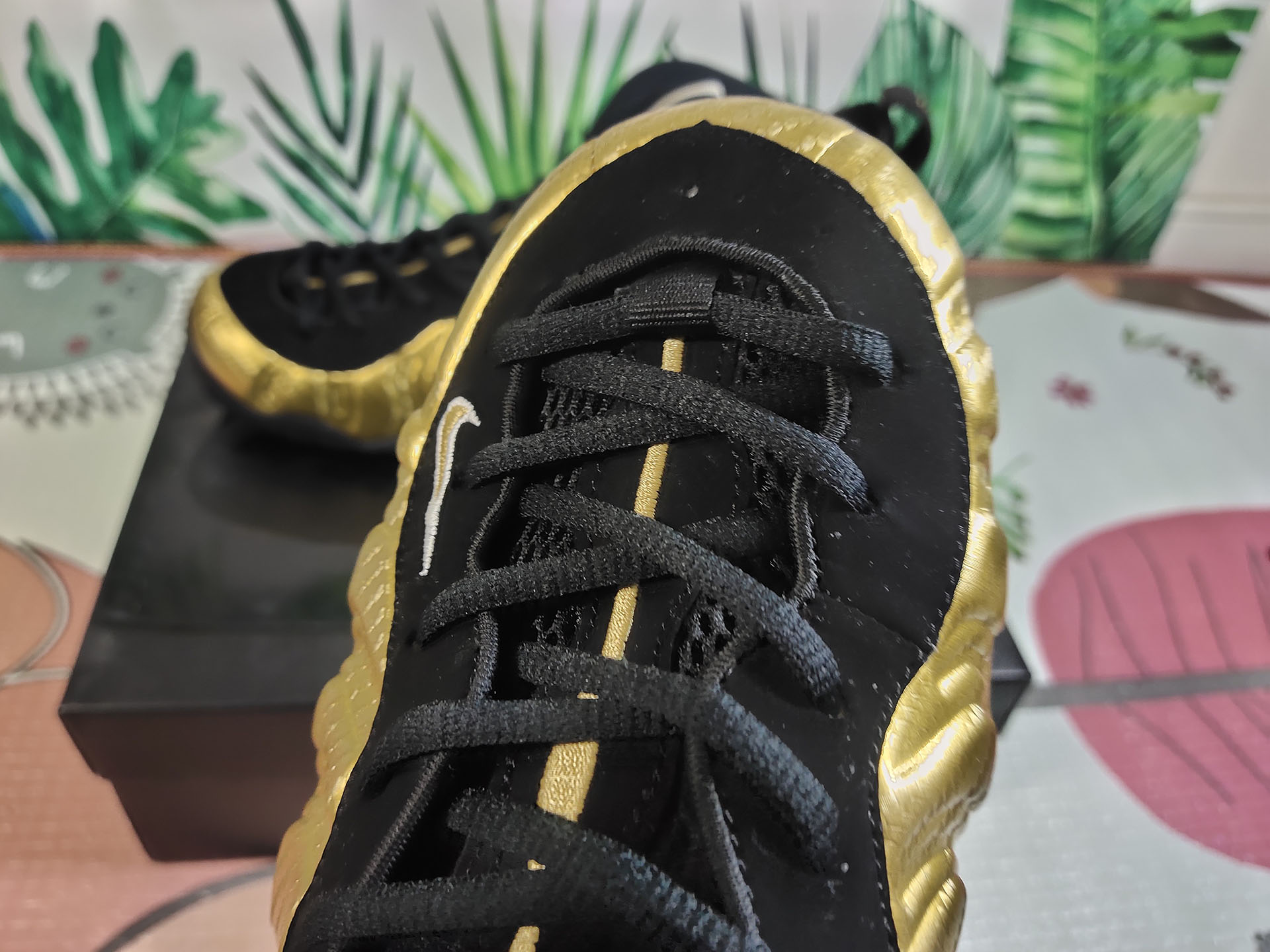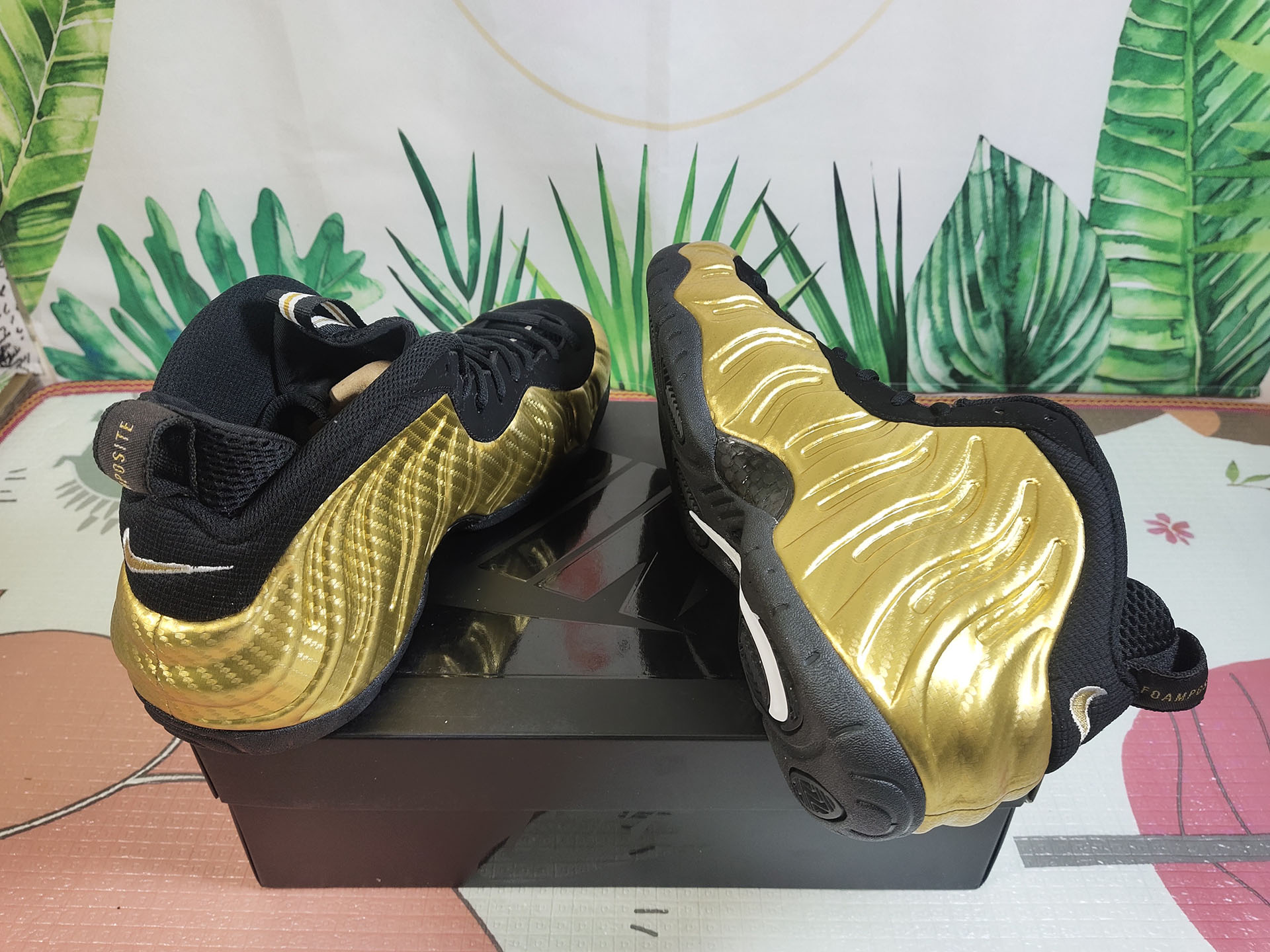 This Nike Air Foamposite Pro features a full Metallic Gold carbon fiber-like Foam shell. Complimenting the Gold is Black detailing on the upper, carbon fiber mid-foot plate and rubber sole.