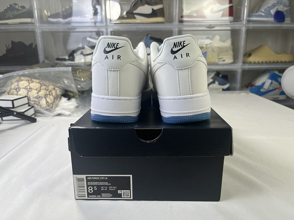 Air Force 1 Low LX UV Reactive features an all-white tumbled leather upper with UV-reactive Swooshes and heel tabs that turn blue and red when exposed to sunlight.
