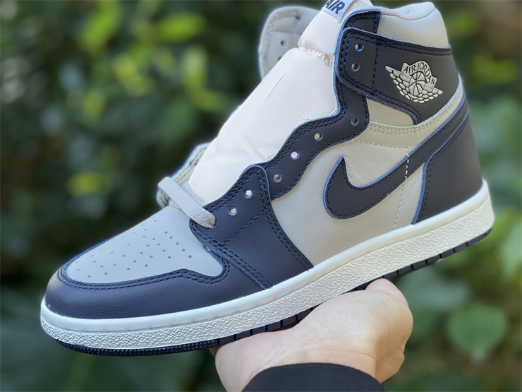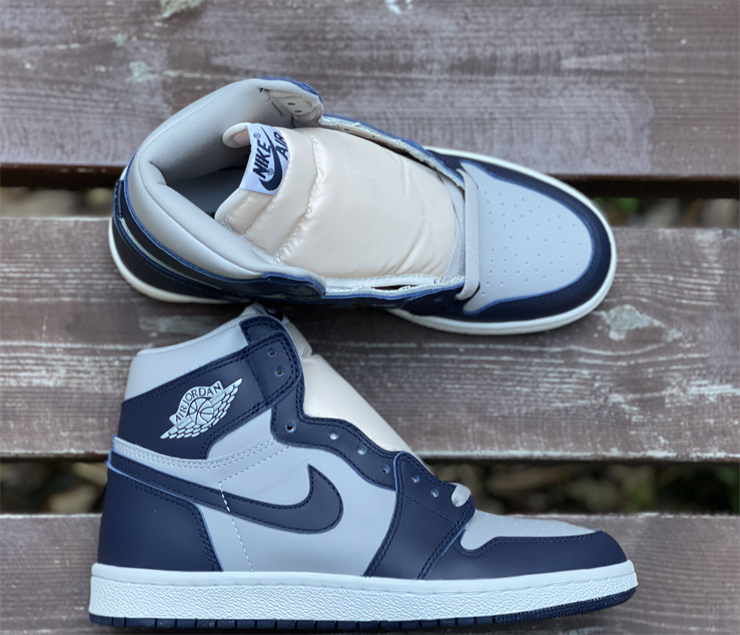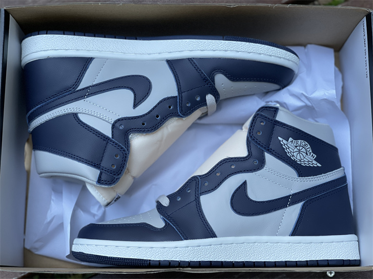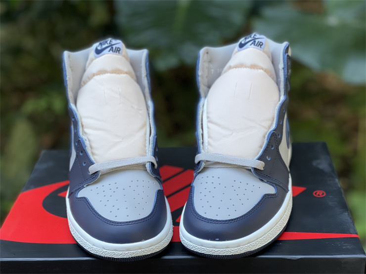 This Air Jordan 1 offering features a grey sole upper with navy blue overlays and a rubber outsole. White Wings logo, tongue and midsole complete the design.