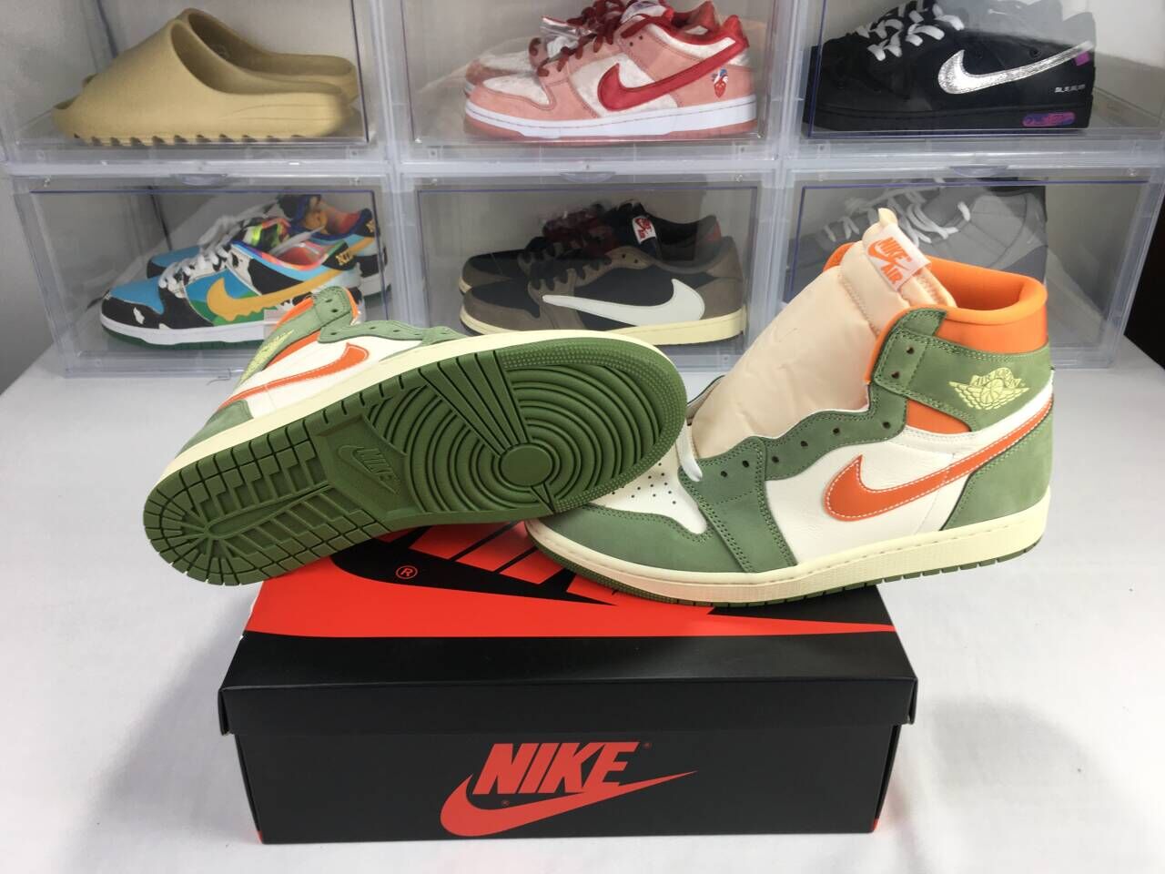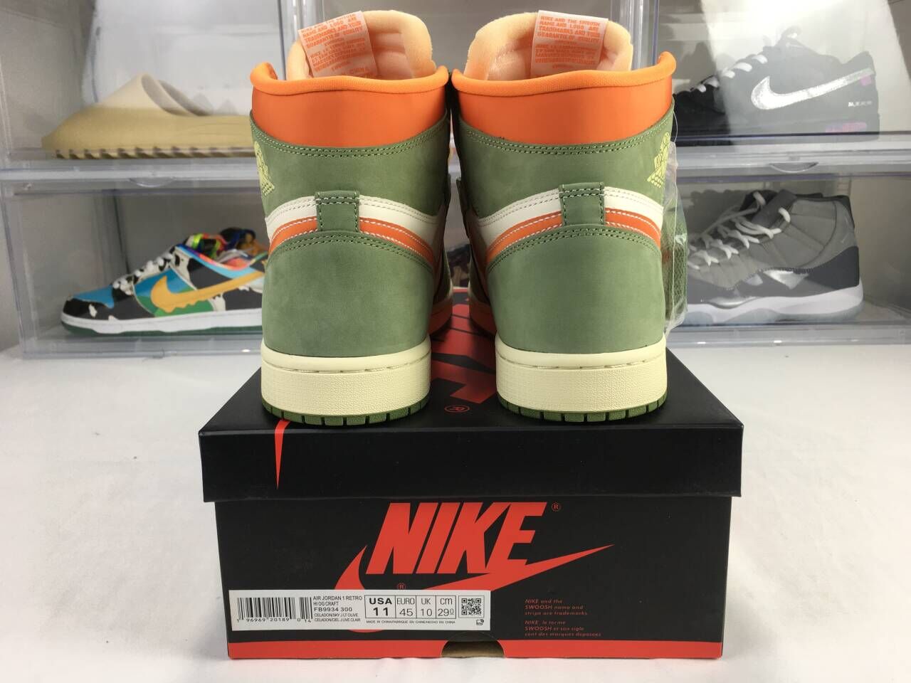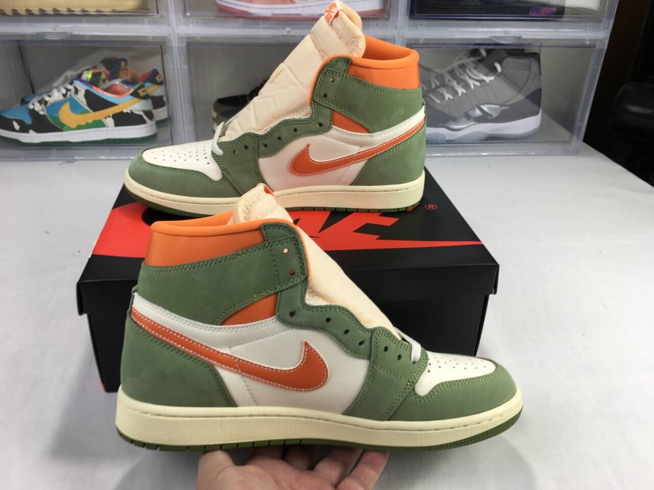AJ1 white leather upper on the basis of adding orange and green matching, olive green part to add suede texture. Tongue of shoe added yellow design exposed sponge. Eye-catching color contrast fashion sense, the side of the shoe orange Swoosh with white stitching.