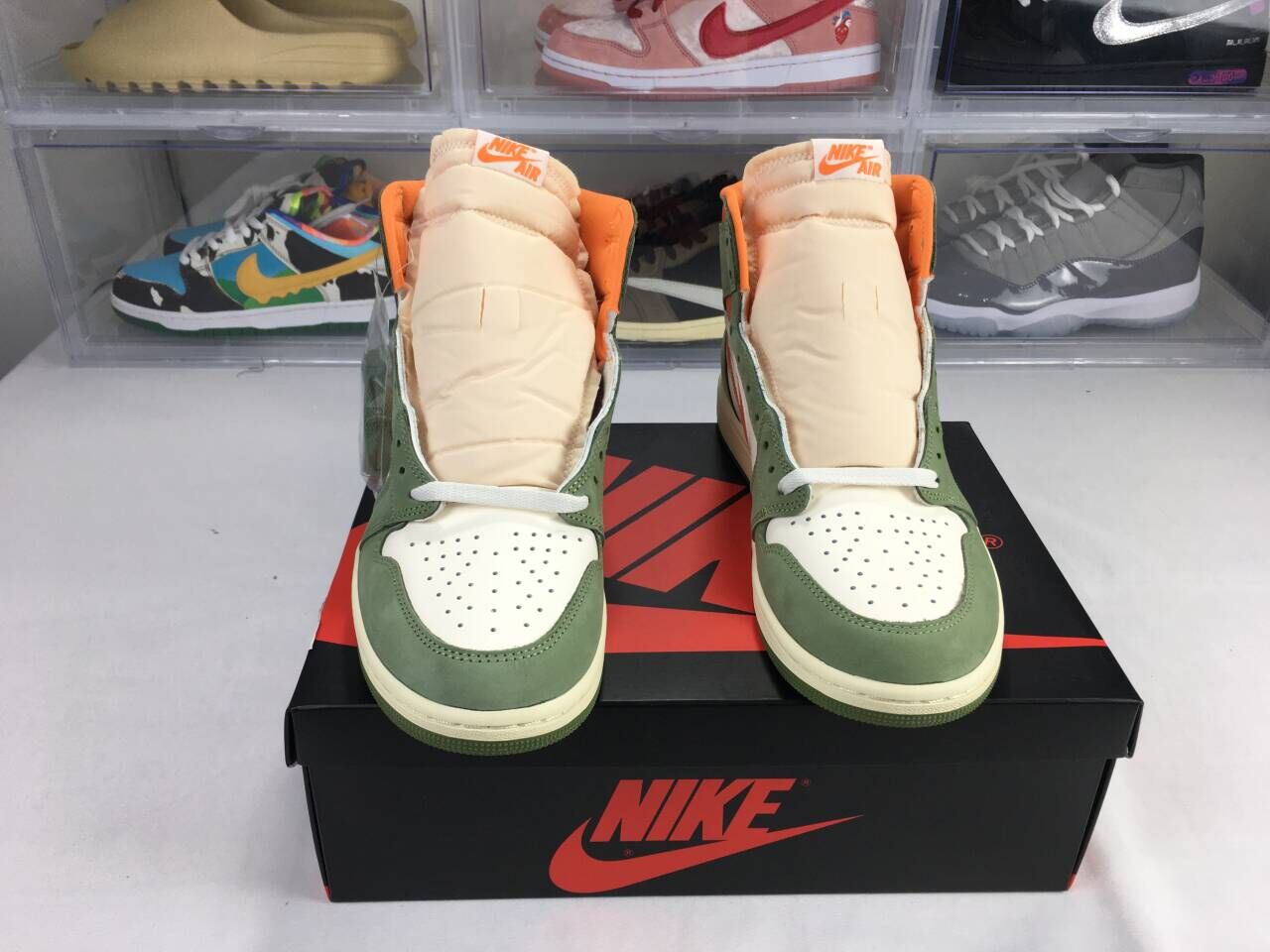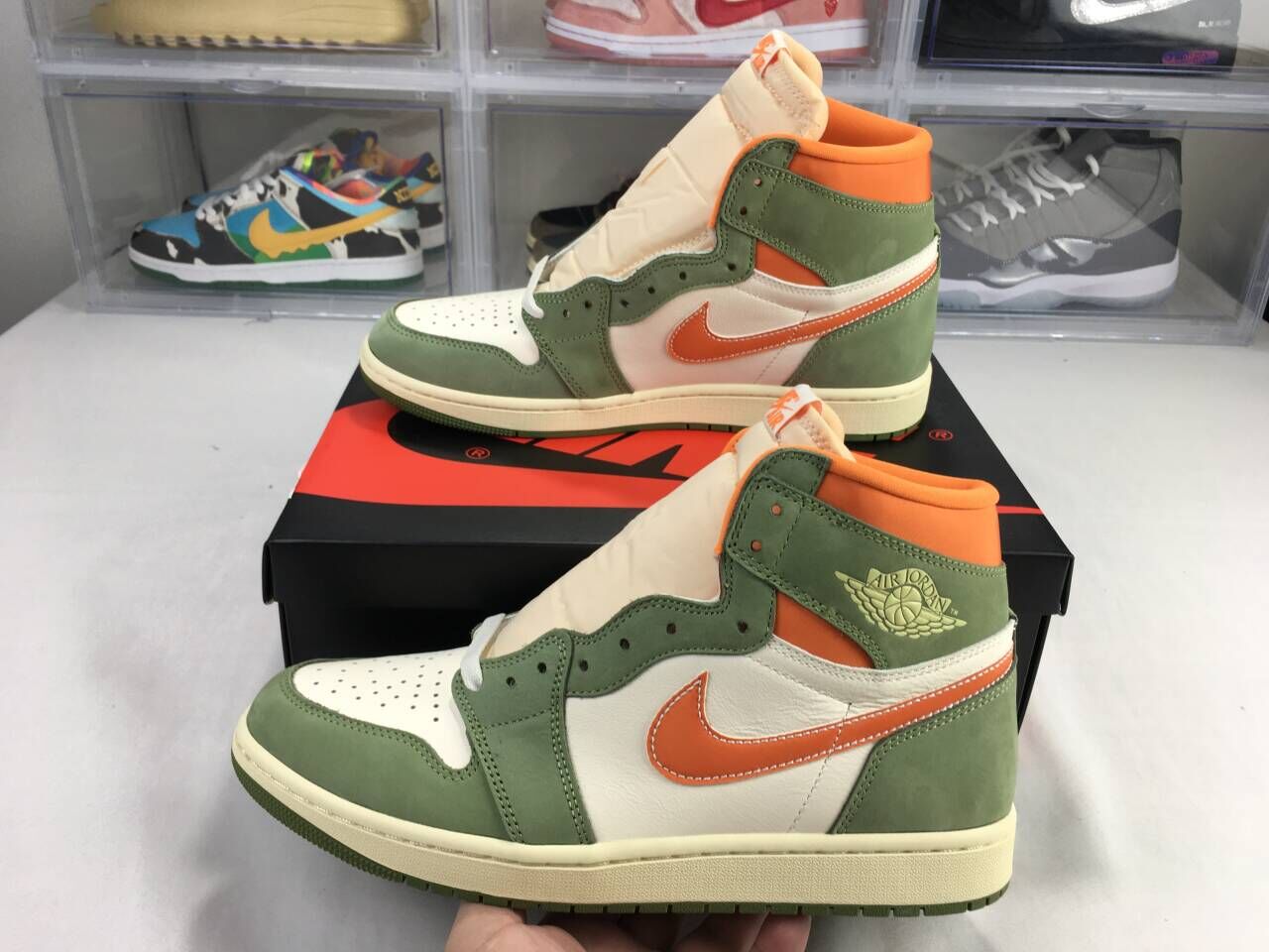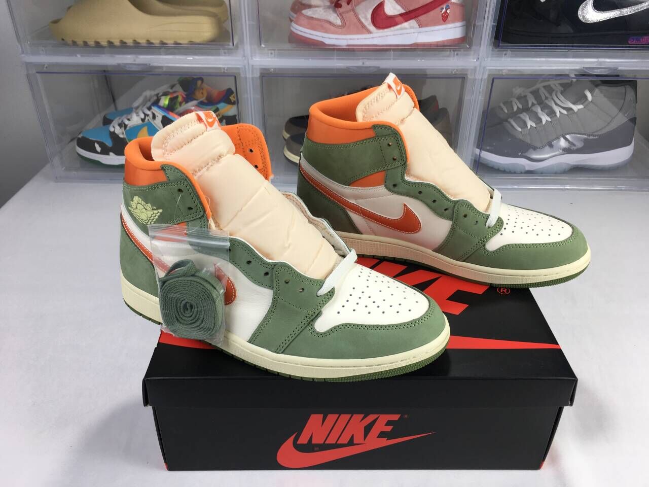 AJ1 white leather upper on the basis of adding orange and green matching, olive green part to add suede texture. Tongue of shoe added yellow design exposed sponge. Eye-catching color contrast fashion sense, the side of the shoe orange Swoosh with white stitching.