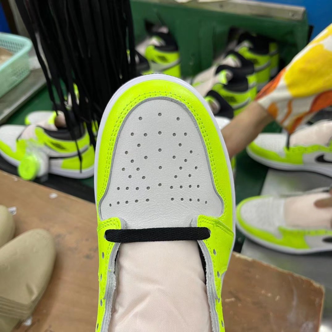 The upper is covered in white, the frame is in neon yellow, and the white midsole is paired with a black rubber outsole. The leather surface of the shoe body is covered with a layer of fine irregular lines. The neon color is matched with the white shoe body, the high-top shoe shape covers the whole body with fluorescent green, and fluorescent yellow is matched with black and white as the main color. The green in summer is also fully covered. The insole uses fluorescent green color matching from the inside to the outside, and the upper Swoosh Logo in black ice crackle style.