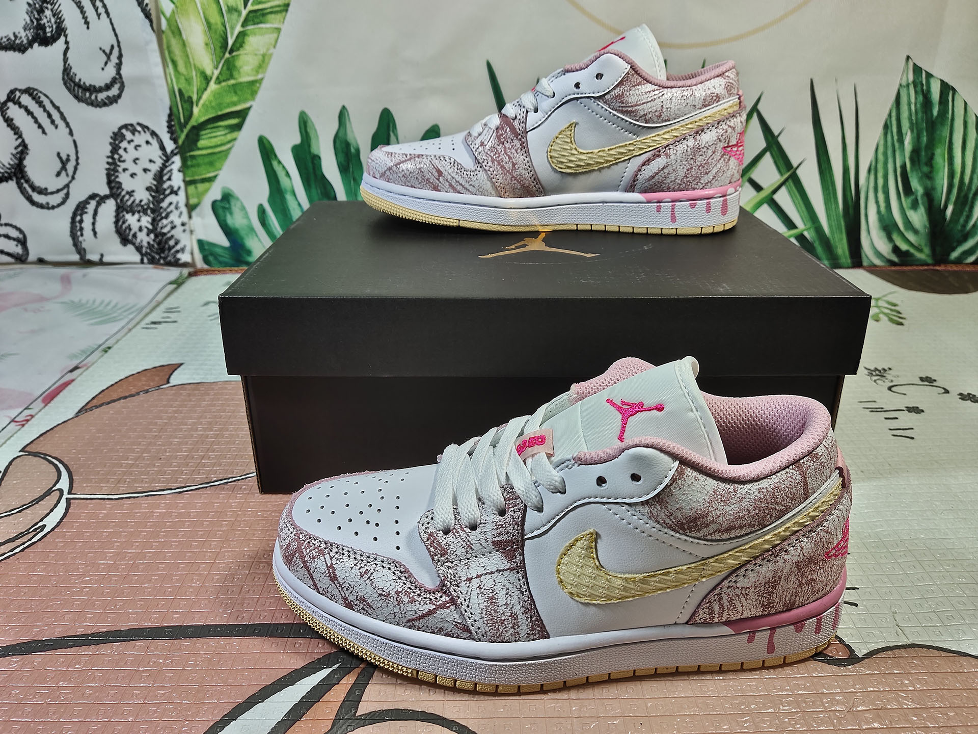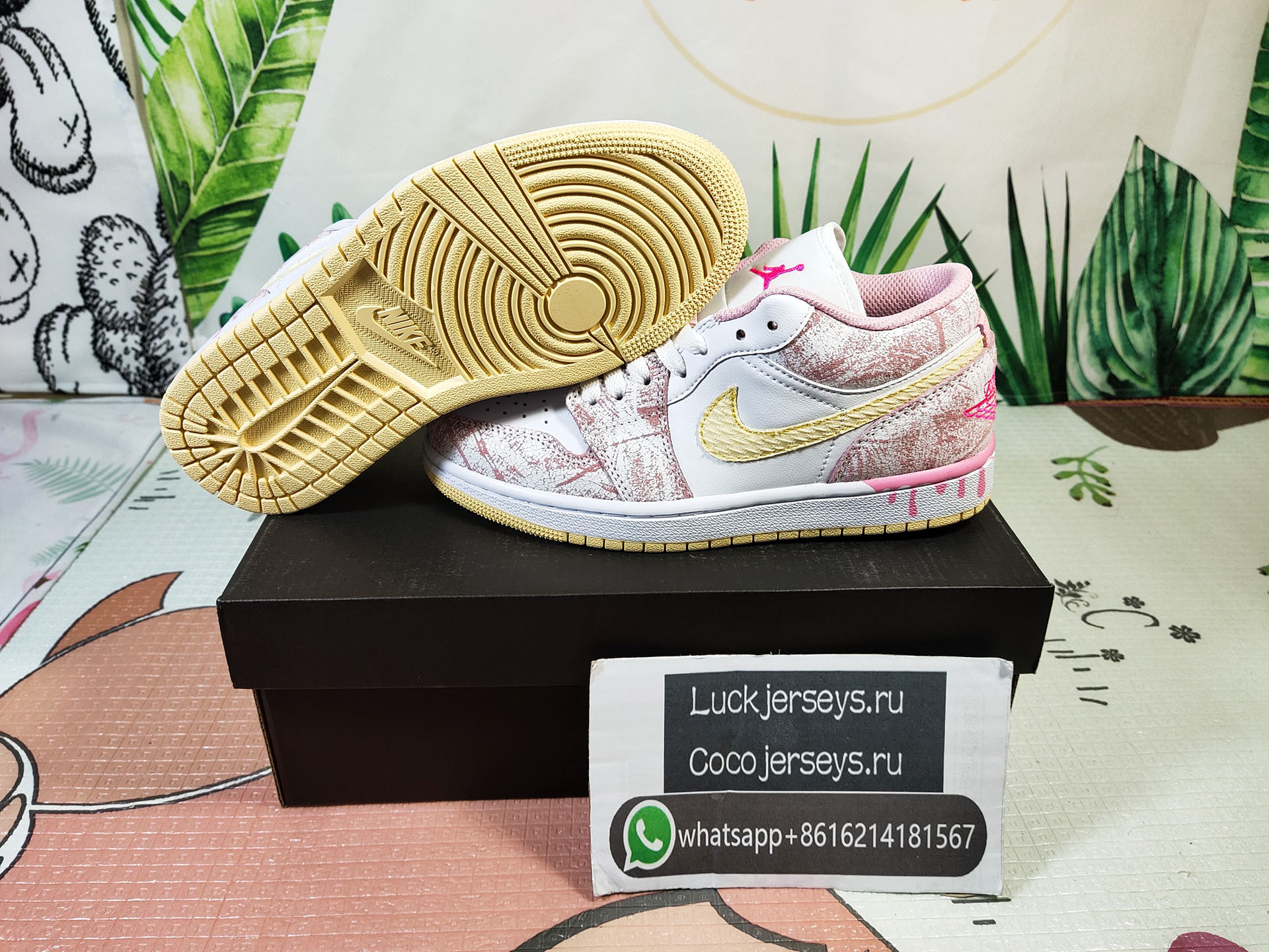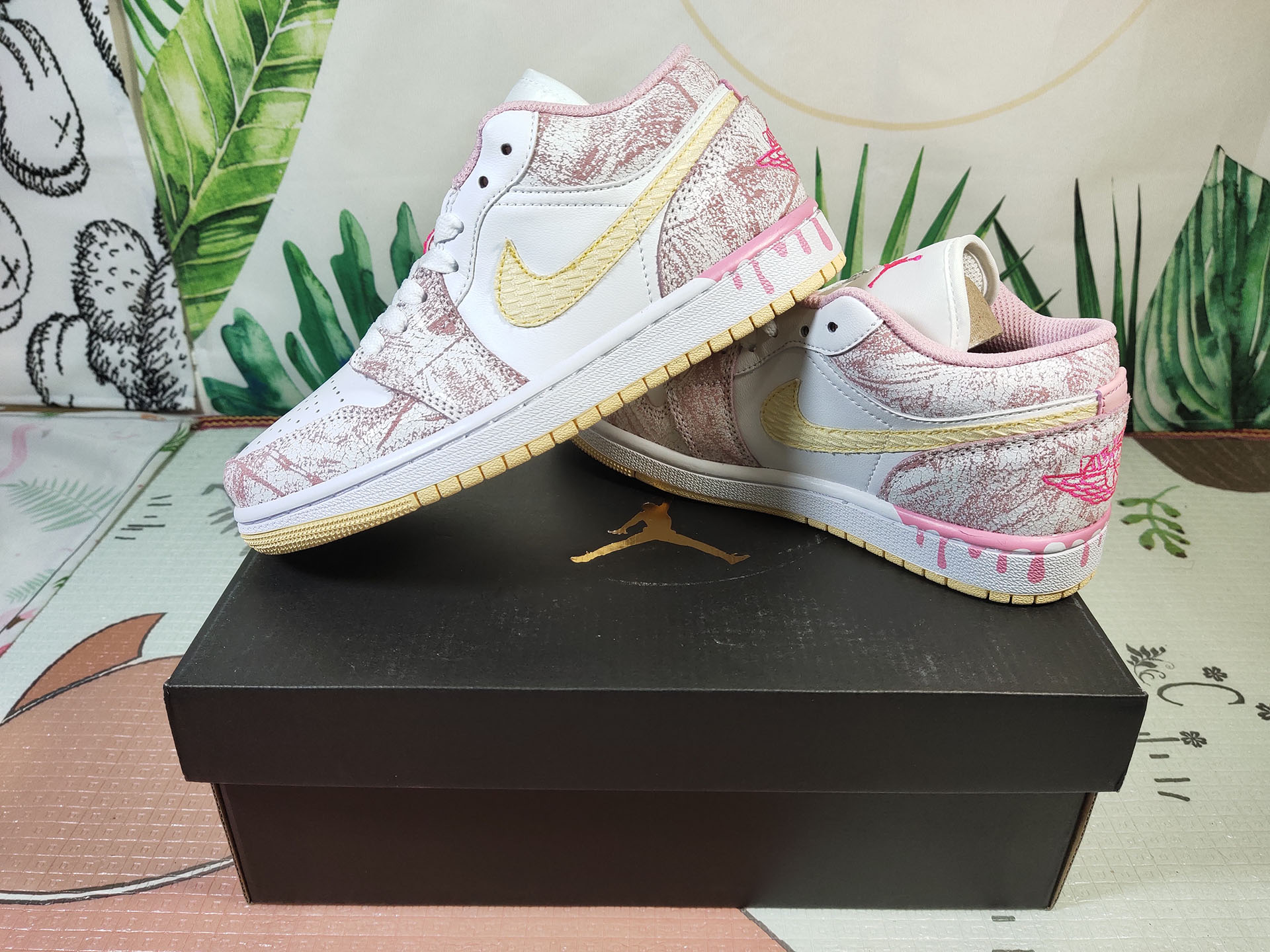 Jordan Air Jordan 1 Low GS Paint Drip AJ1 powder ice cream low-top sneakers CW7104-601. The whole pair of shoes looks like ice cream, and the pink color creates a lovely atmosphere. The shoe body is made of white leather with washed pink leather girl's heart.