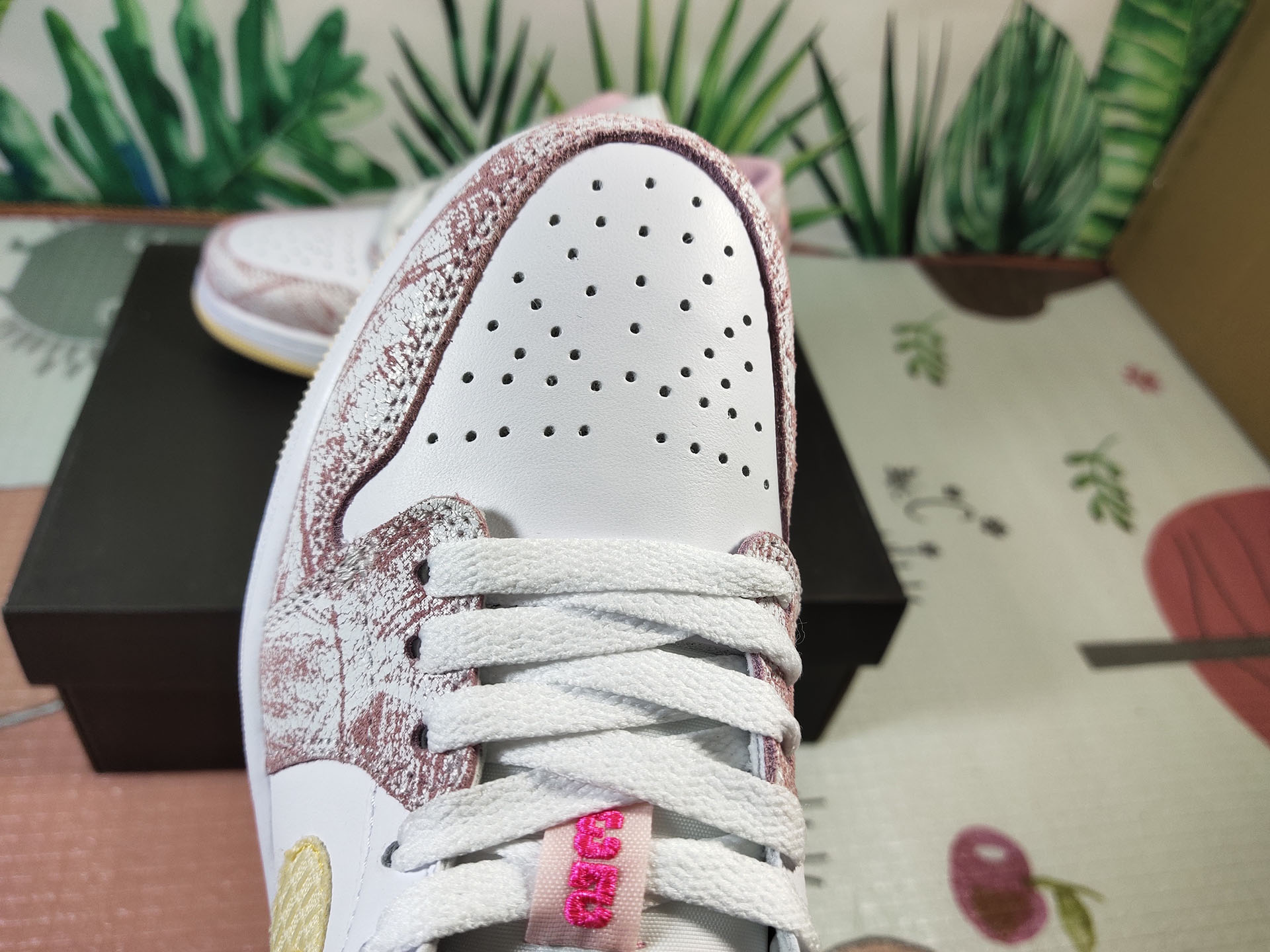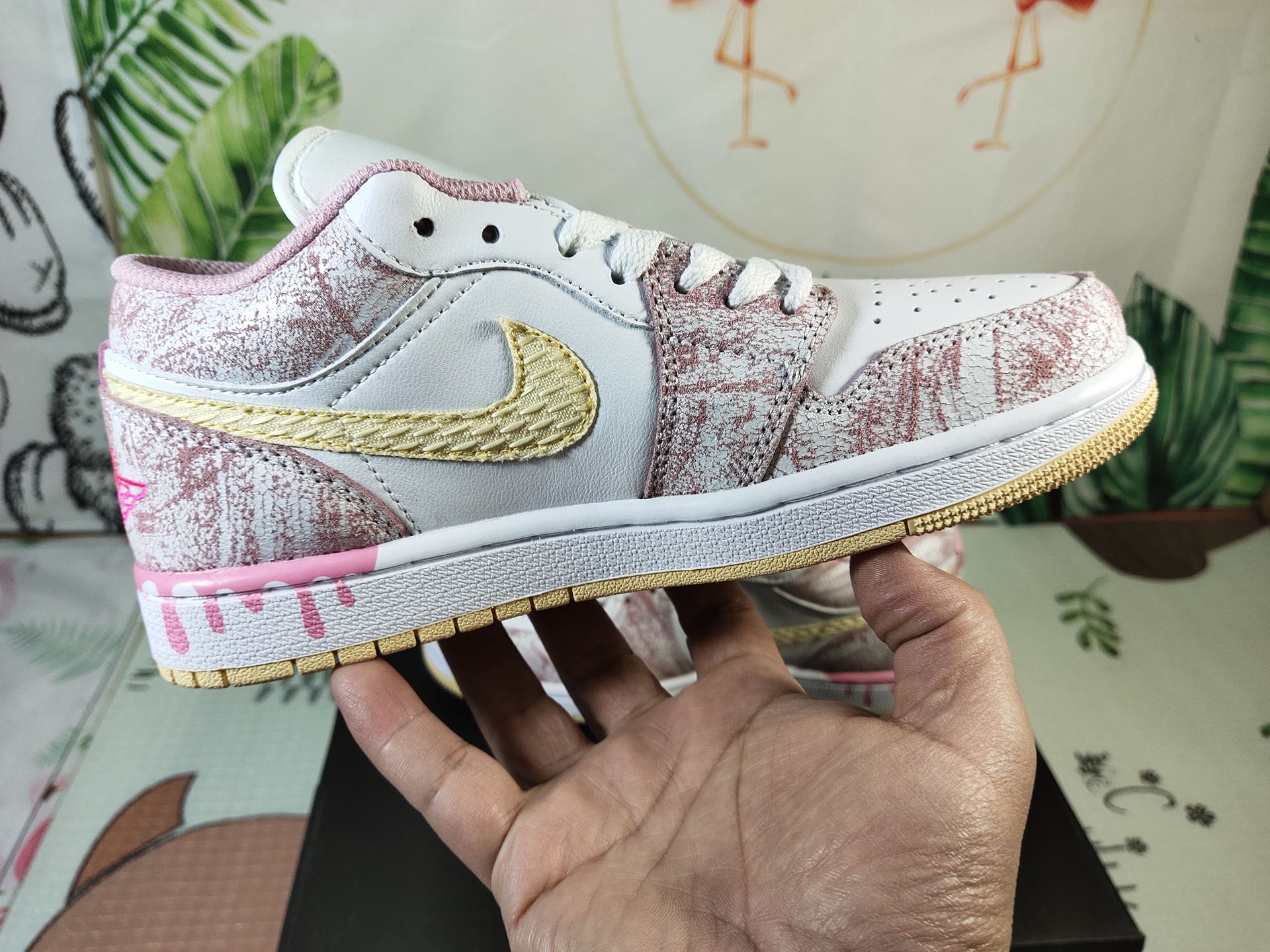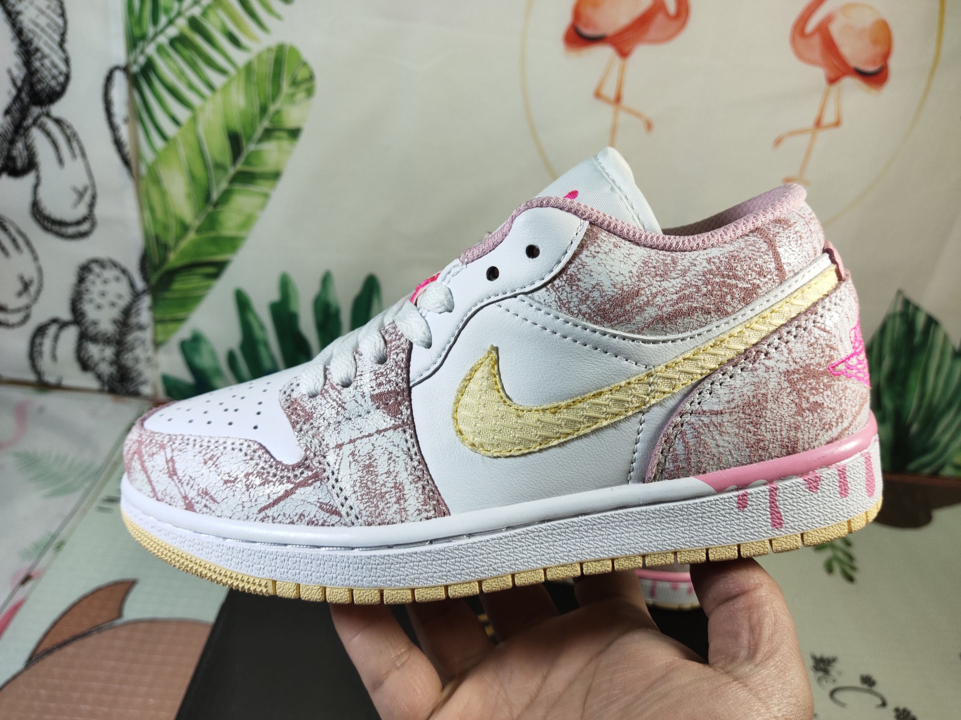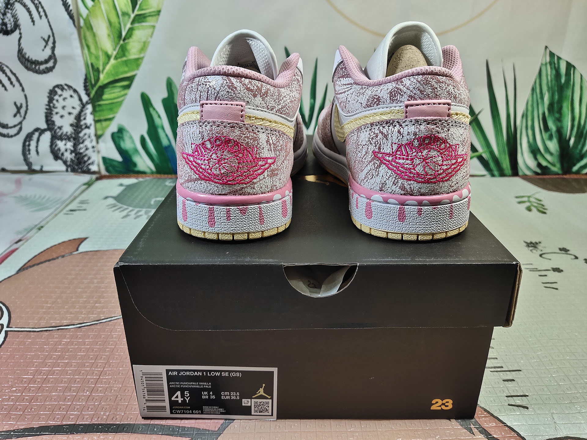 Jordan Air Jordan 1 Low GS Paint Drip AJ1 powder ice cream low-top sneakers CW7104-601. The whole pair of shoes looks like ice cream, and the pink color creates a lovely atmosphere. The shoe body is made of white leather with washed pink leather girl's heart.