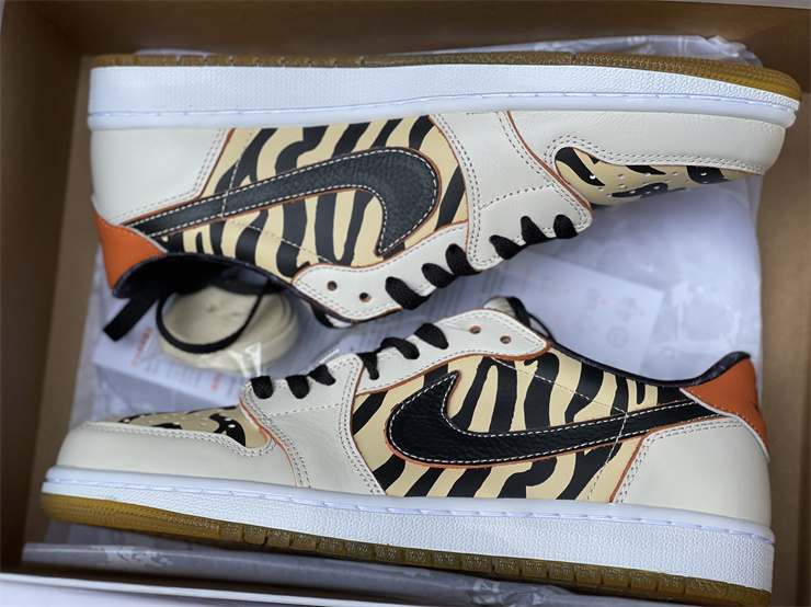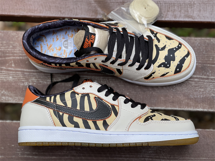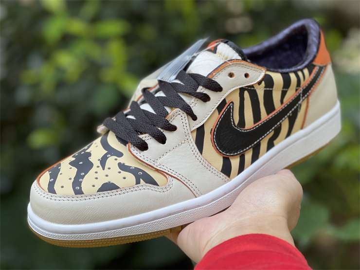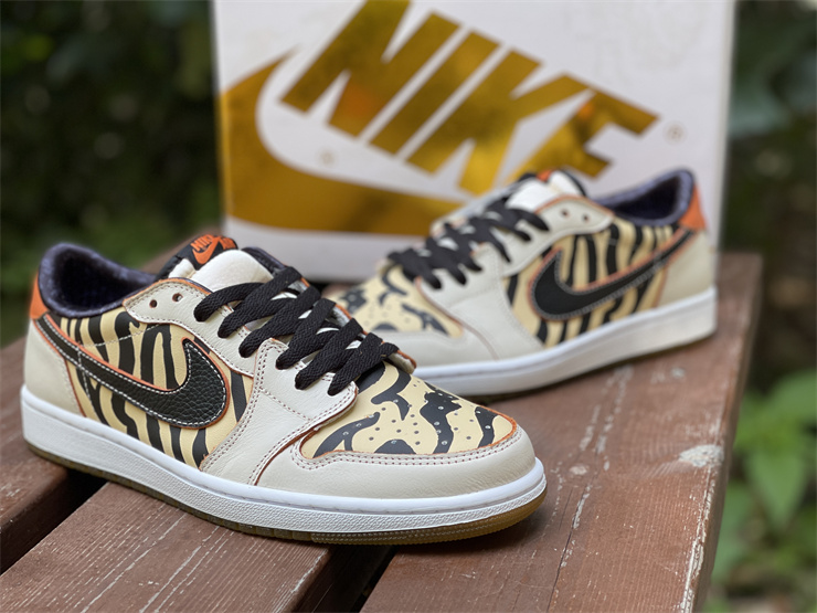 Black Swoosh with white stitching on the side of the shoe, and cream leather on the frame. The shoe body has a black texture, and the orange-yellow texture between the gaps of the shoe body is matched. The upper is embellished with a black tiger pattern in the form of calligraphy, and the upper is made of leather fabric with tiger skin.