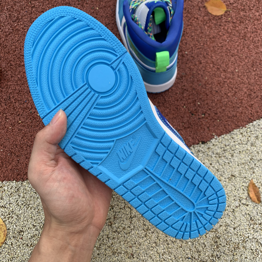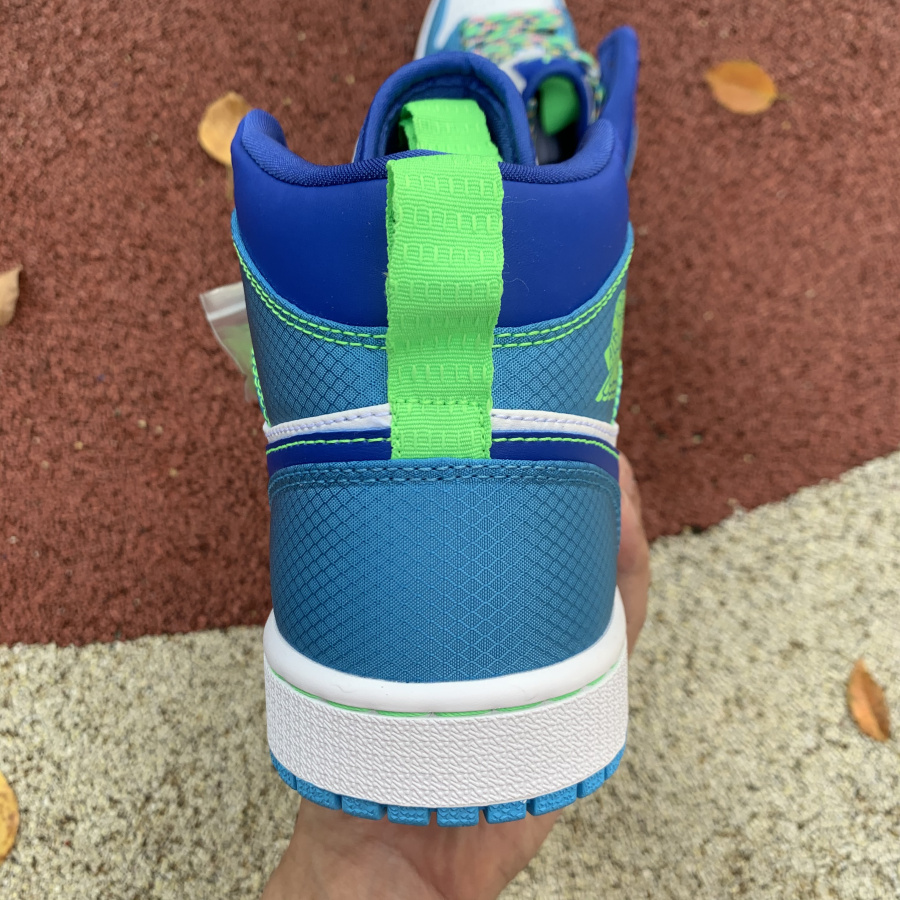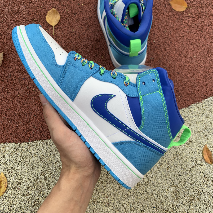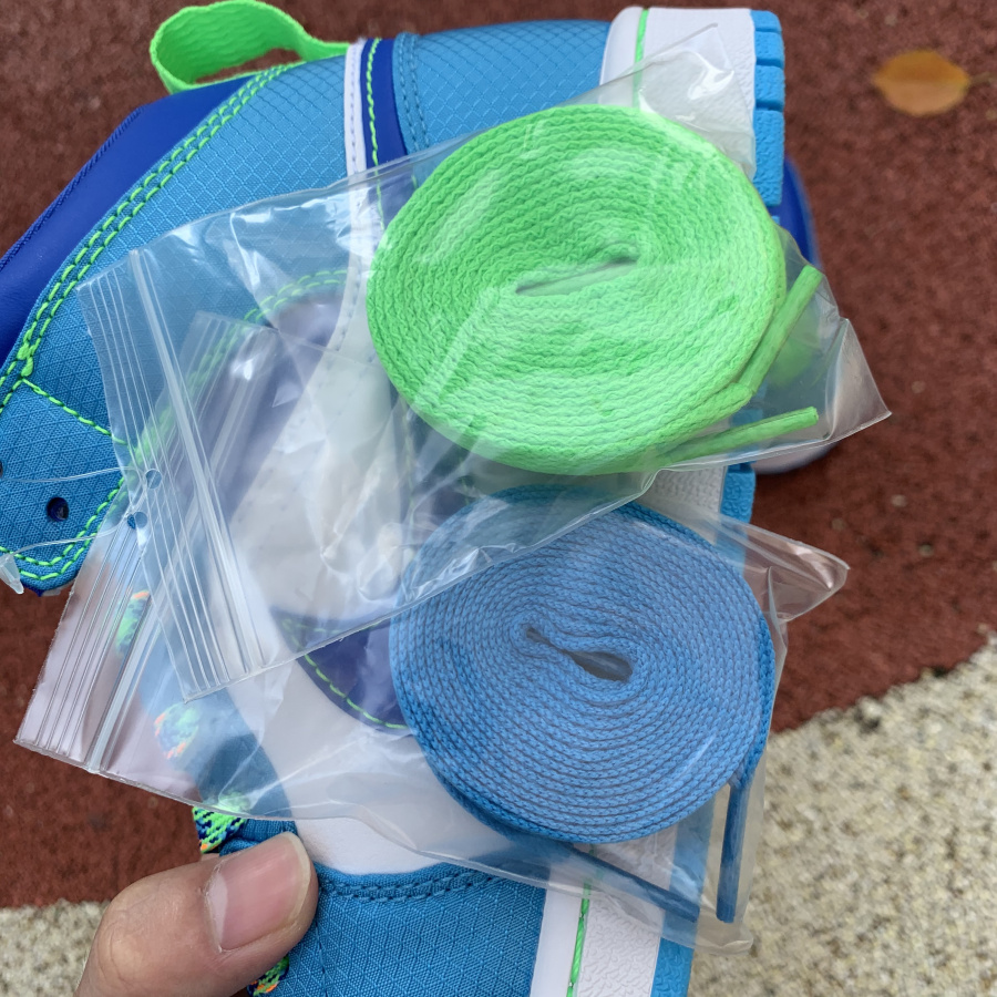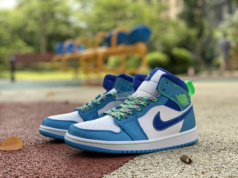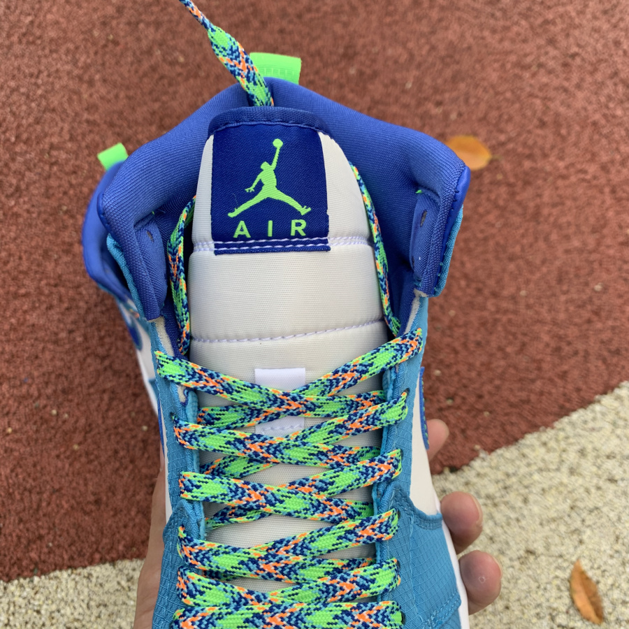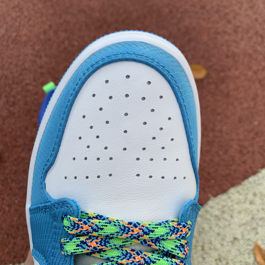 Multicolor laces secure an upper that combines a white leather base with a Racer Blue Swoosh and woven textile overlays in Dark Powder Blue.