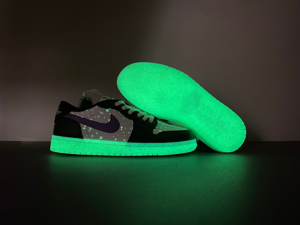 Black and Peak White uppers with bright Raspberry Black trim, shiny light fluorescent yellow outsoles and unique glow-in-the-dark details will help you turn heads with every step. Also comes with space basketball themed stickers!