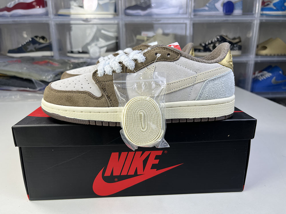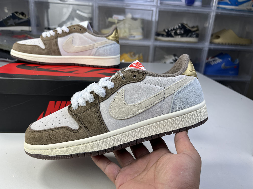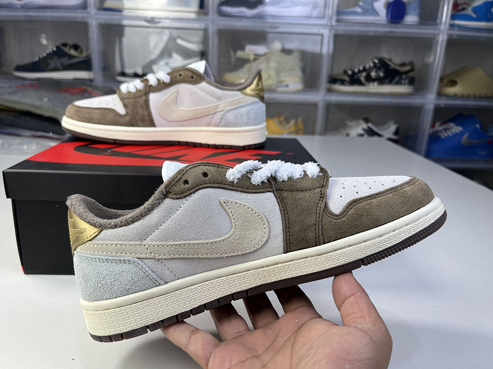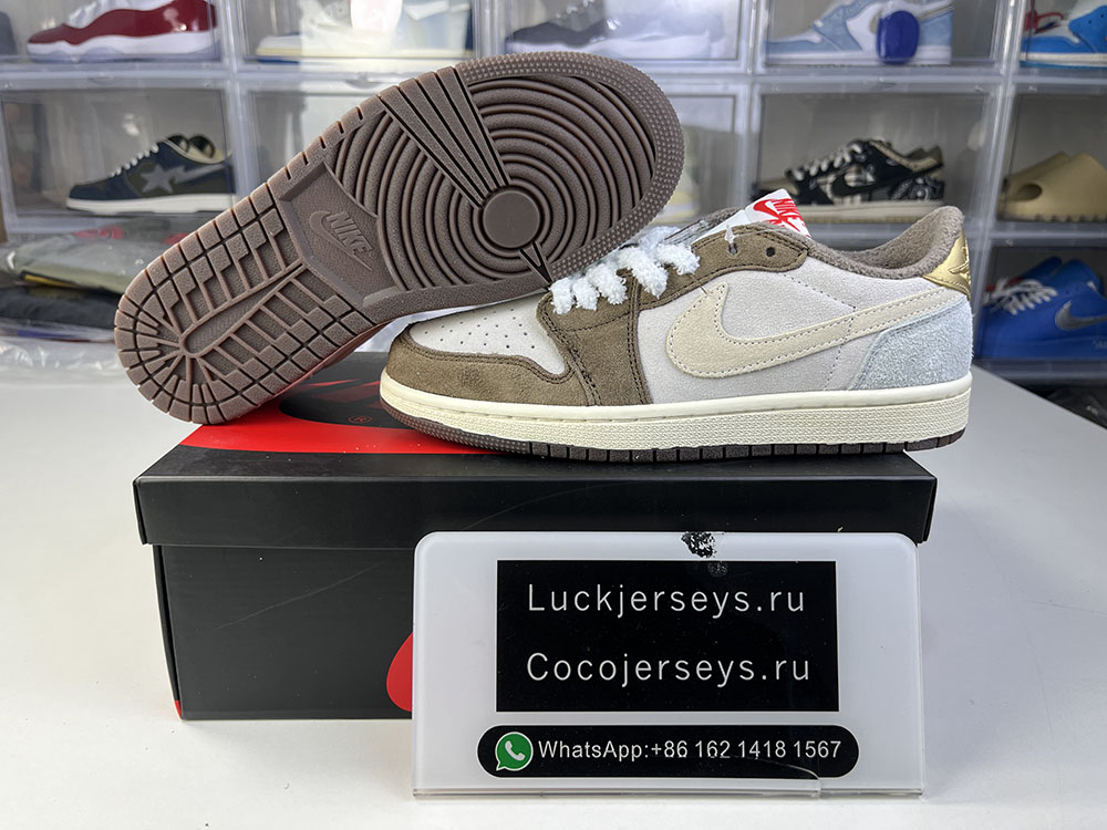 Mocha and white, the body looks like Travis Scott's signature from an overhead perspective, and the tongue is decorated with a rabbit motif that echoes the Year of the Rabbit. The red insole matches the Jumpman Logo, with a red numbered number under the tongue.