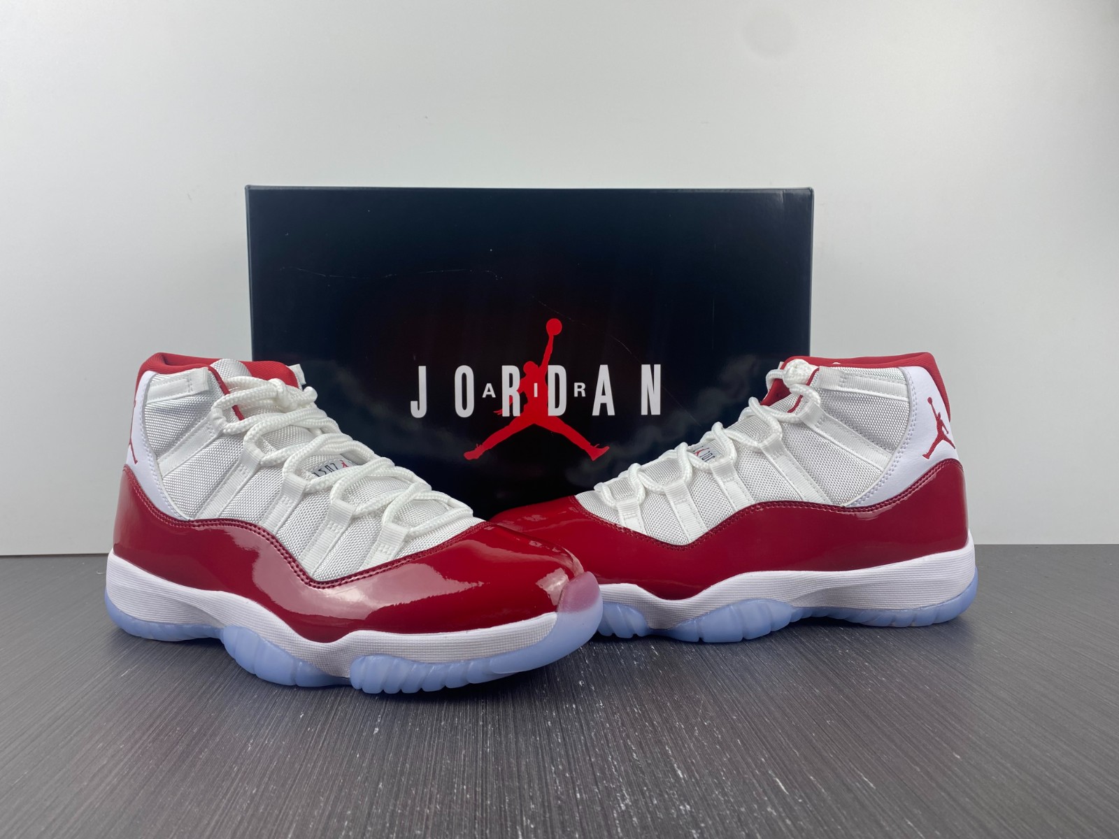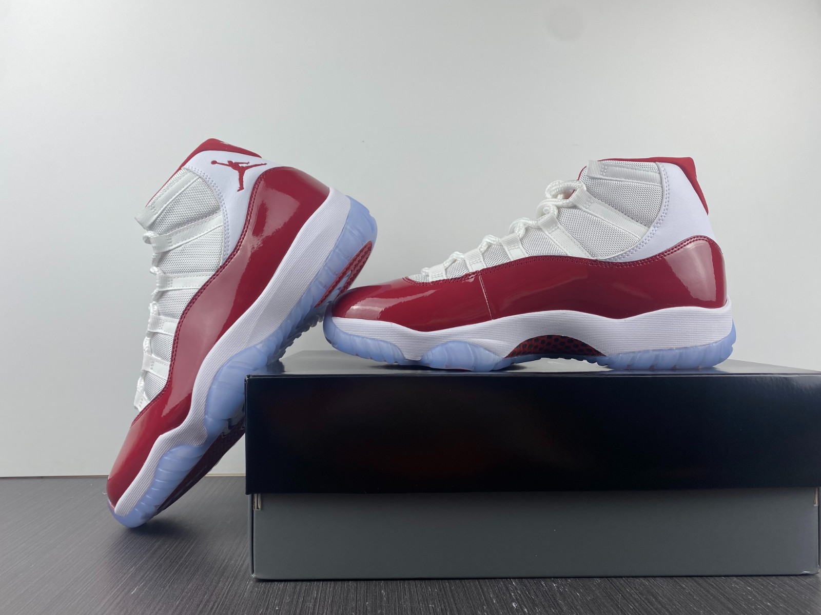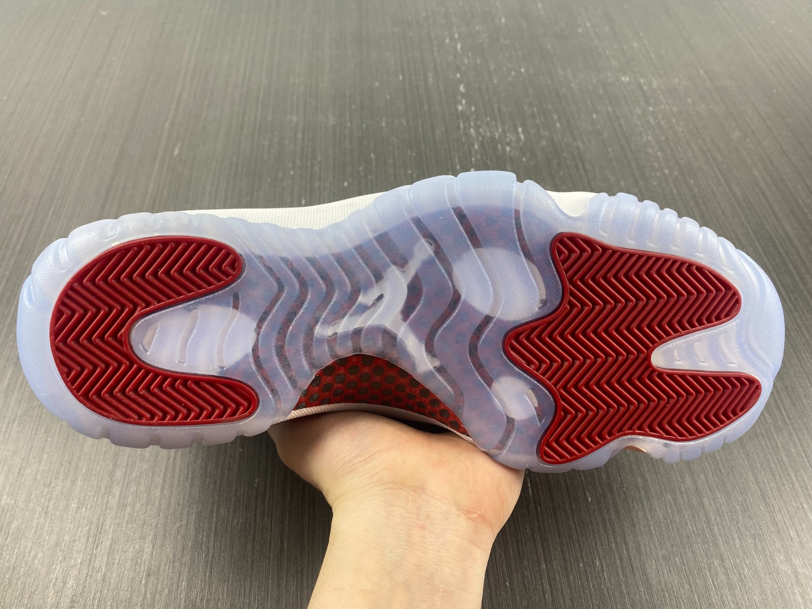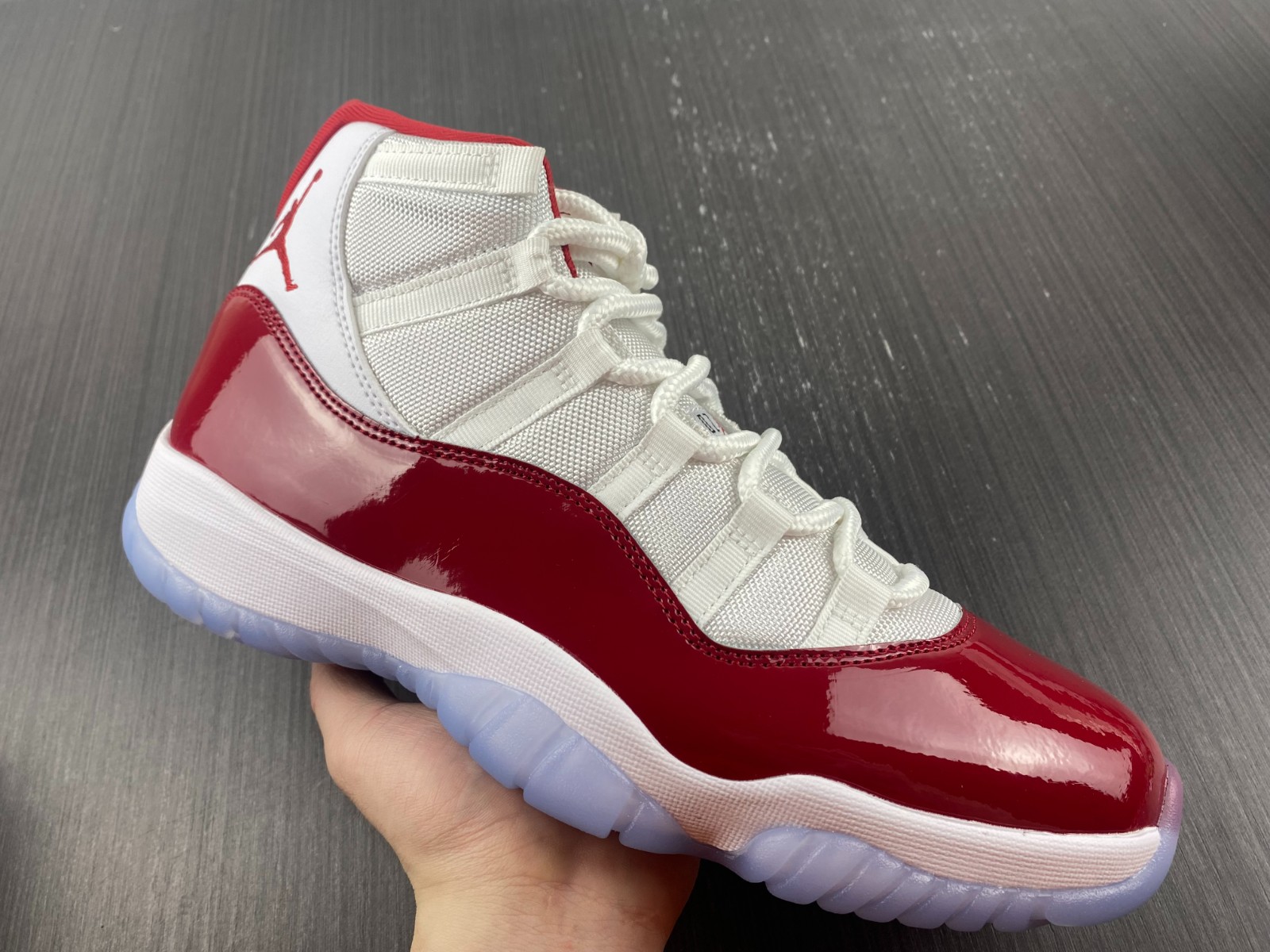 White mesh with red patent leather throughout. The heel is embroidered with trapeze, and the midsole is supported by carbon fiber board. The white midsole and translucent outsole are decorated with a red Jumpman on the heel and tongue. The red and black carbon plate can be seen through the outsole.