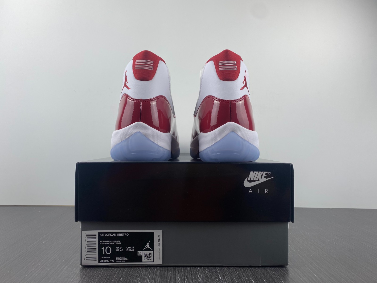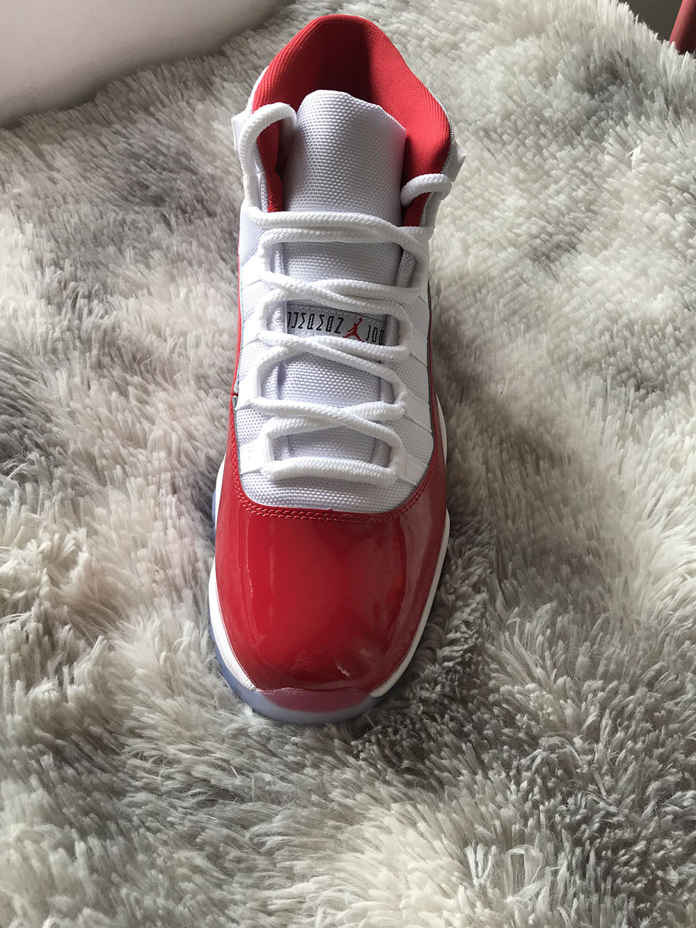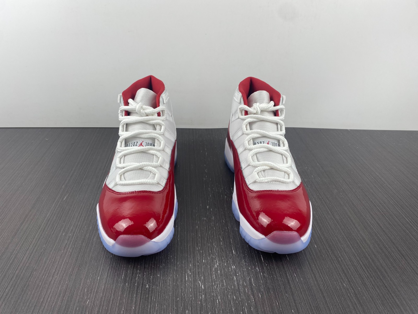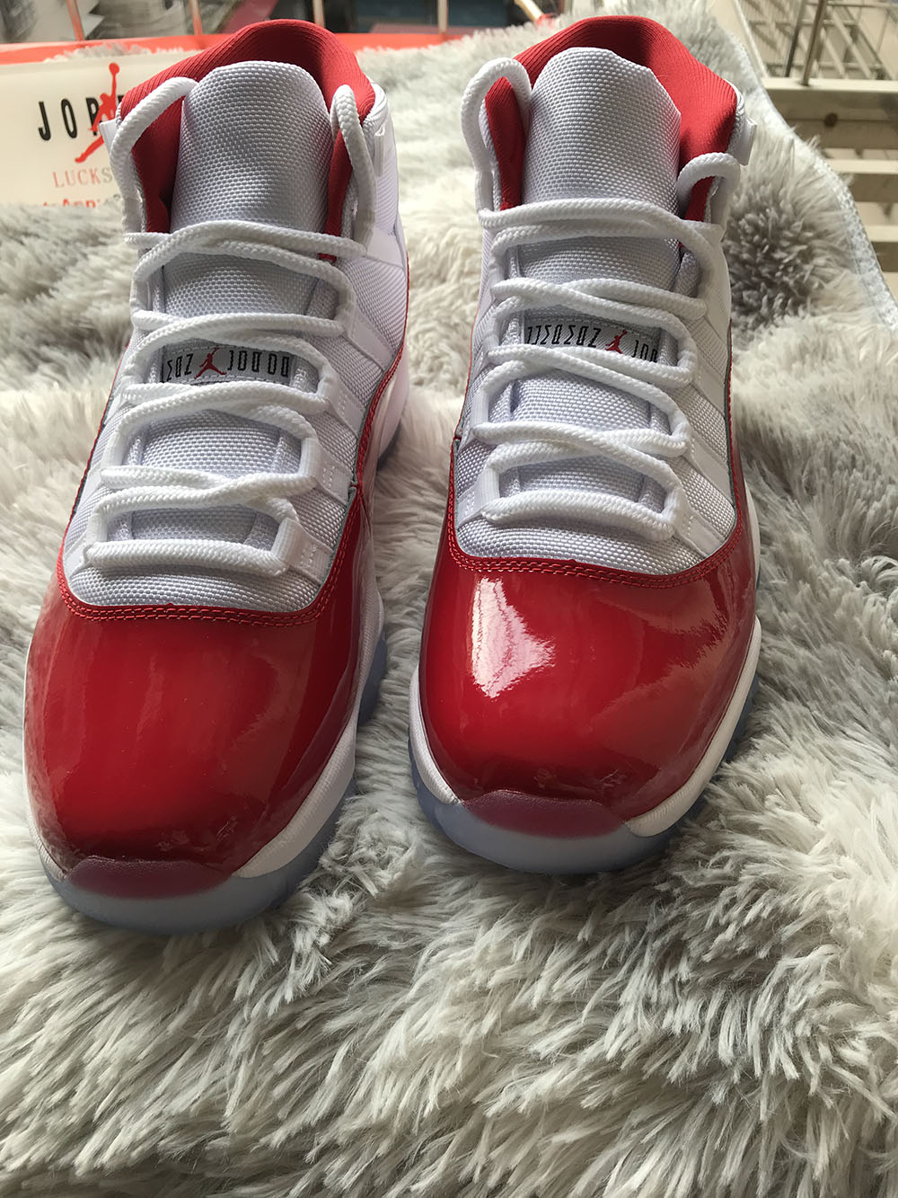 White mesh with red patent leather throughout. The heel is embroidered with trapeze, and the midsole is supported by carbon fiber board. The white midsole and translucent outsole are decorated with a red Jumpman on the heel and tongue. The red and black carbon plate can be seen through the outsole.