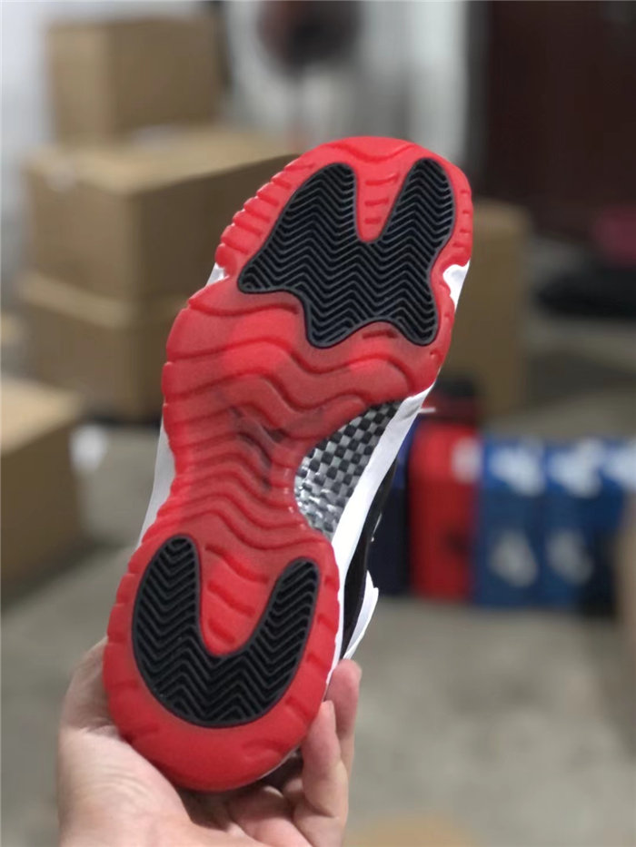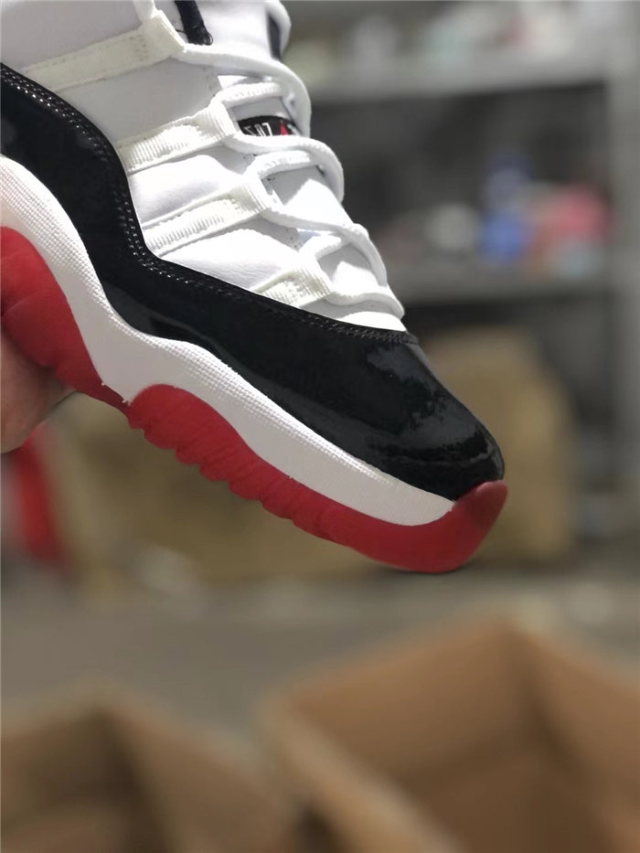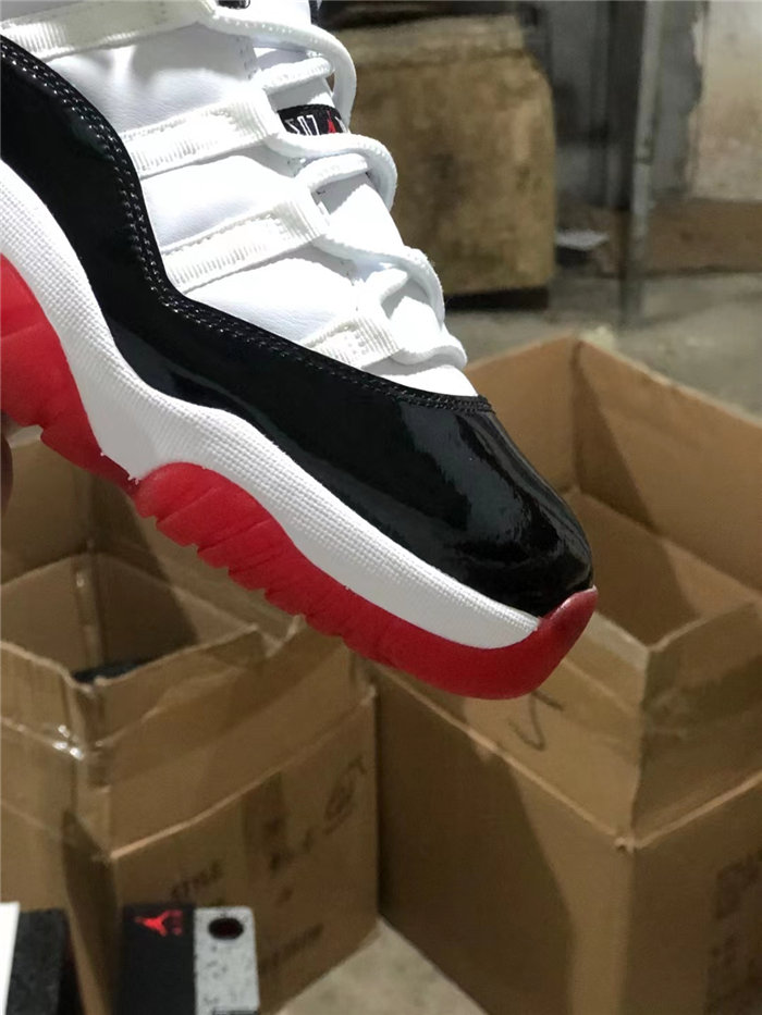 The white leather upper is reminiscent of the ‘Concord’ Jordan 11, highlighted by tonal webbing lace loops and black patent leather overlay. Meanwhile, the pairing of the white foam midsole with a semi-translucent red rubber outsole immediately calls to mind the ‘Bred’ colorway.