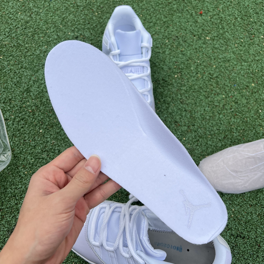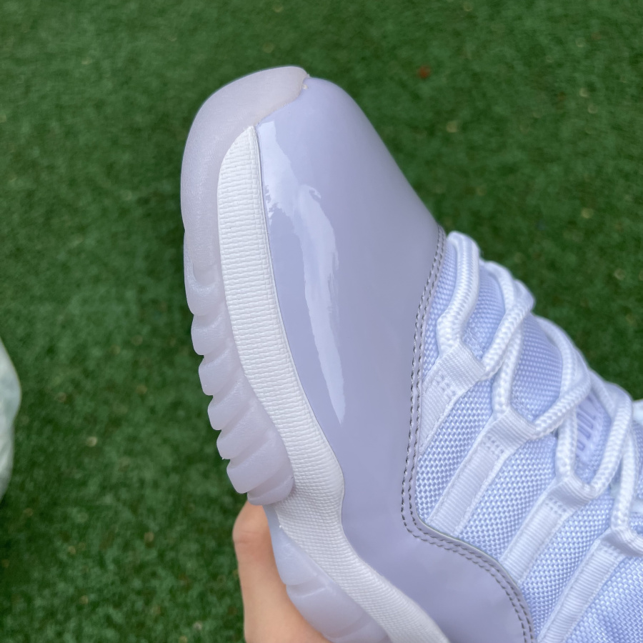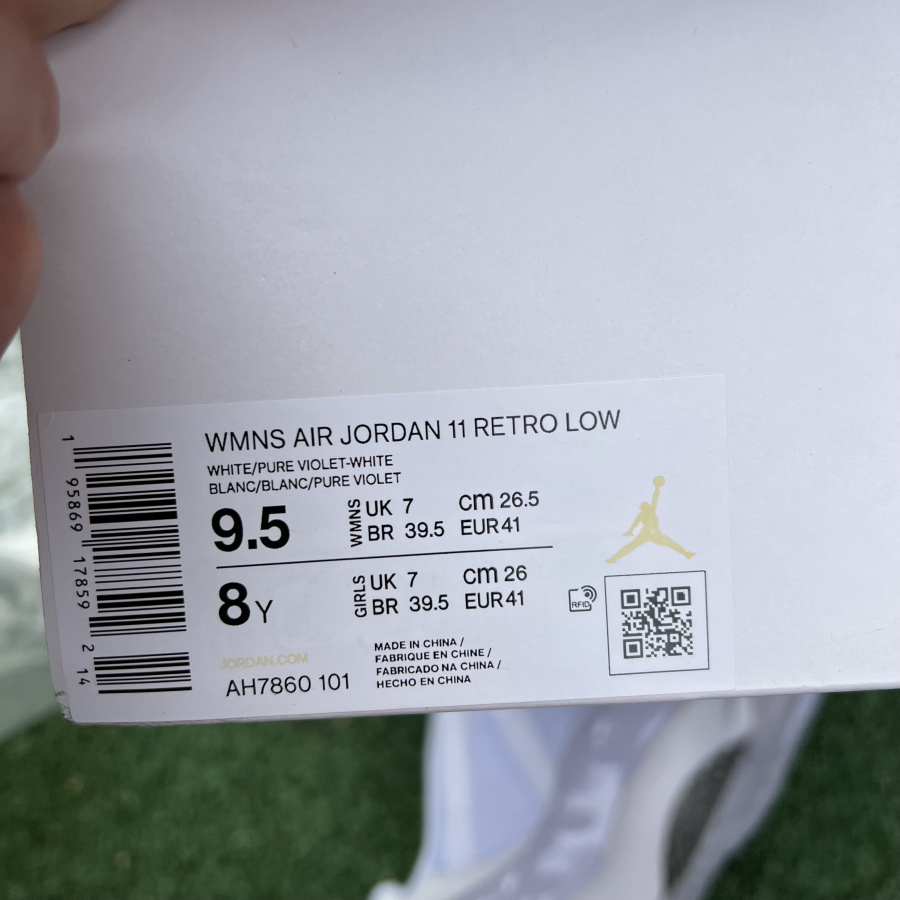 White and pure purple color scheme. This Air Jordan 11 Low features a White leather upper and tongue with Pure Violet patent leather overlays and sockliner. A White midsole atop an icy translucent outsole completes the design.