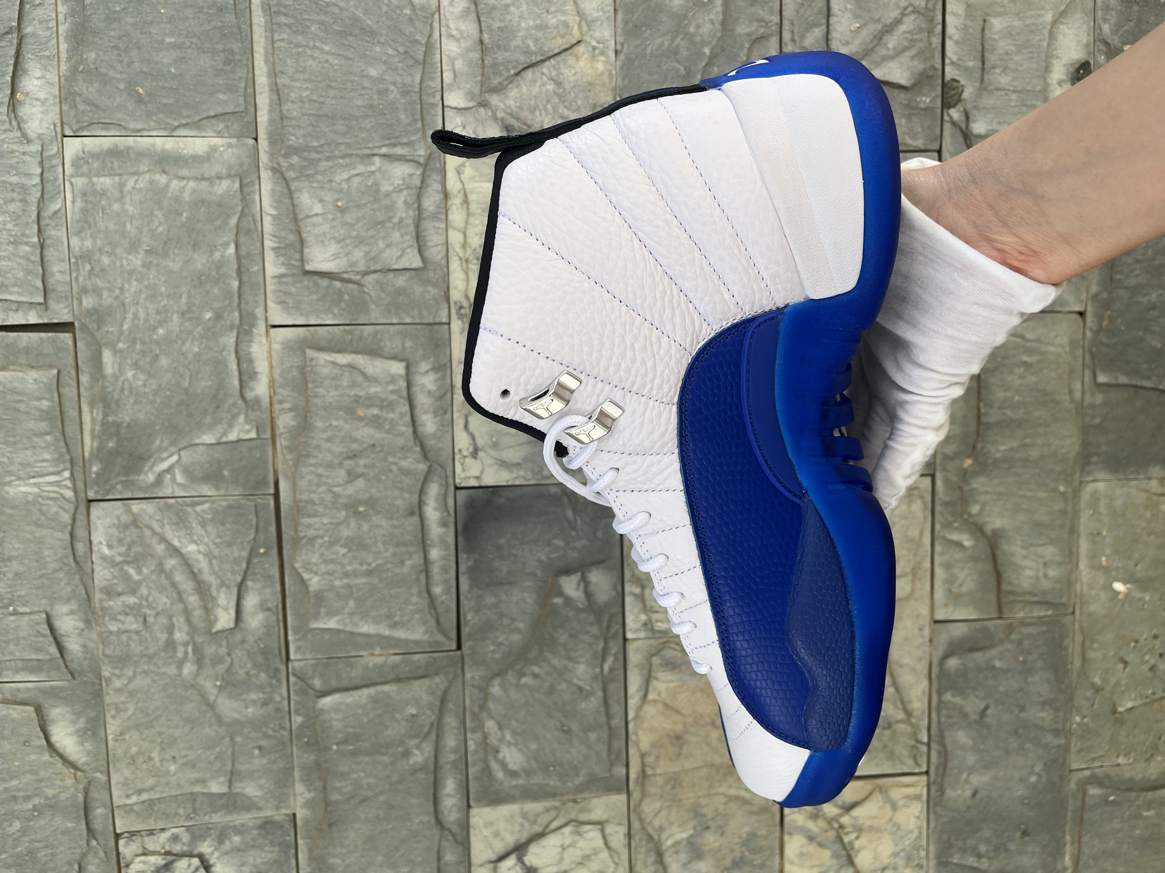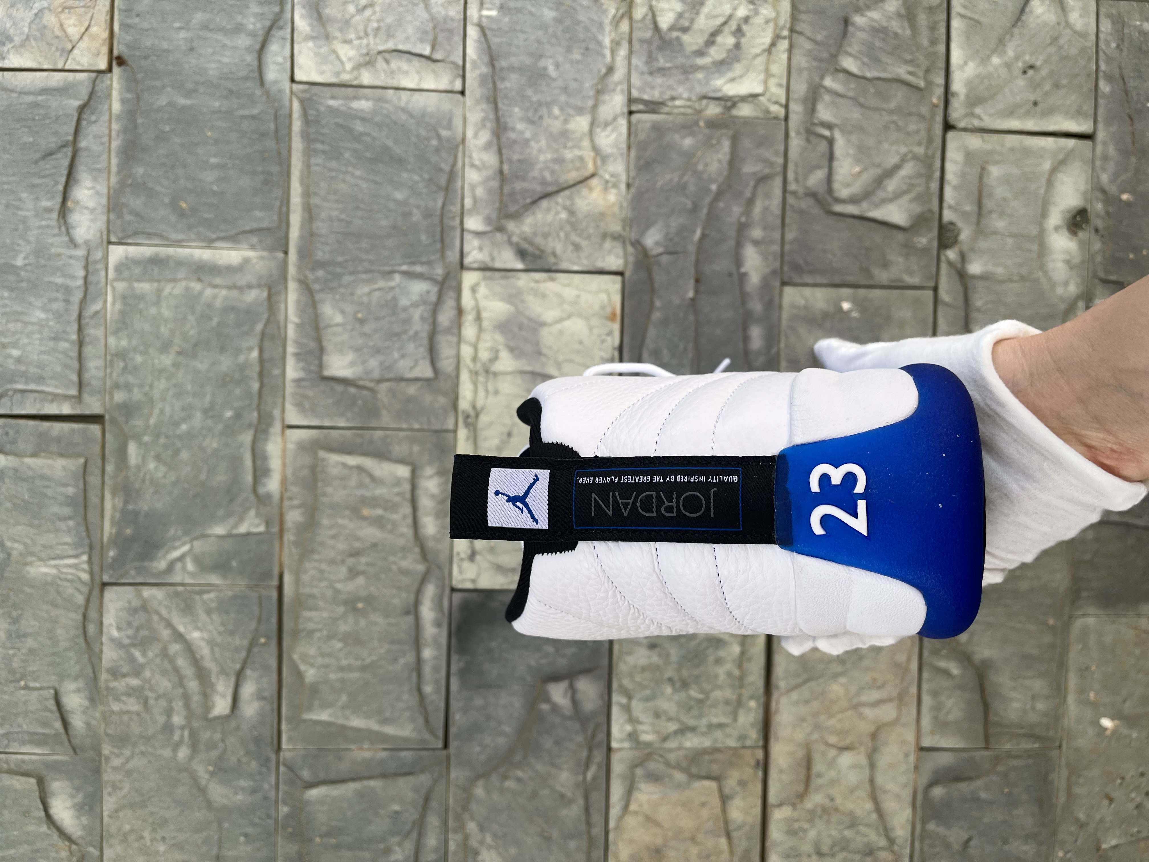 The silver buckle on the side of the shoe echoes the black Jumpman Logo and details on the toe. The details are carefully considered and eye-catching in the blue and white tone. The AJ12 shoe body is made of blue and white leather with black lining, the tongue is decorated with black fonts, and the Jumpman Logo is presented in black embroidery. The blue Jumpman Logo and white embroidered Jordan on the heel are matched with white debossed 23. The square logo with blue and white tones is eye-catching.