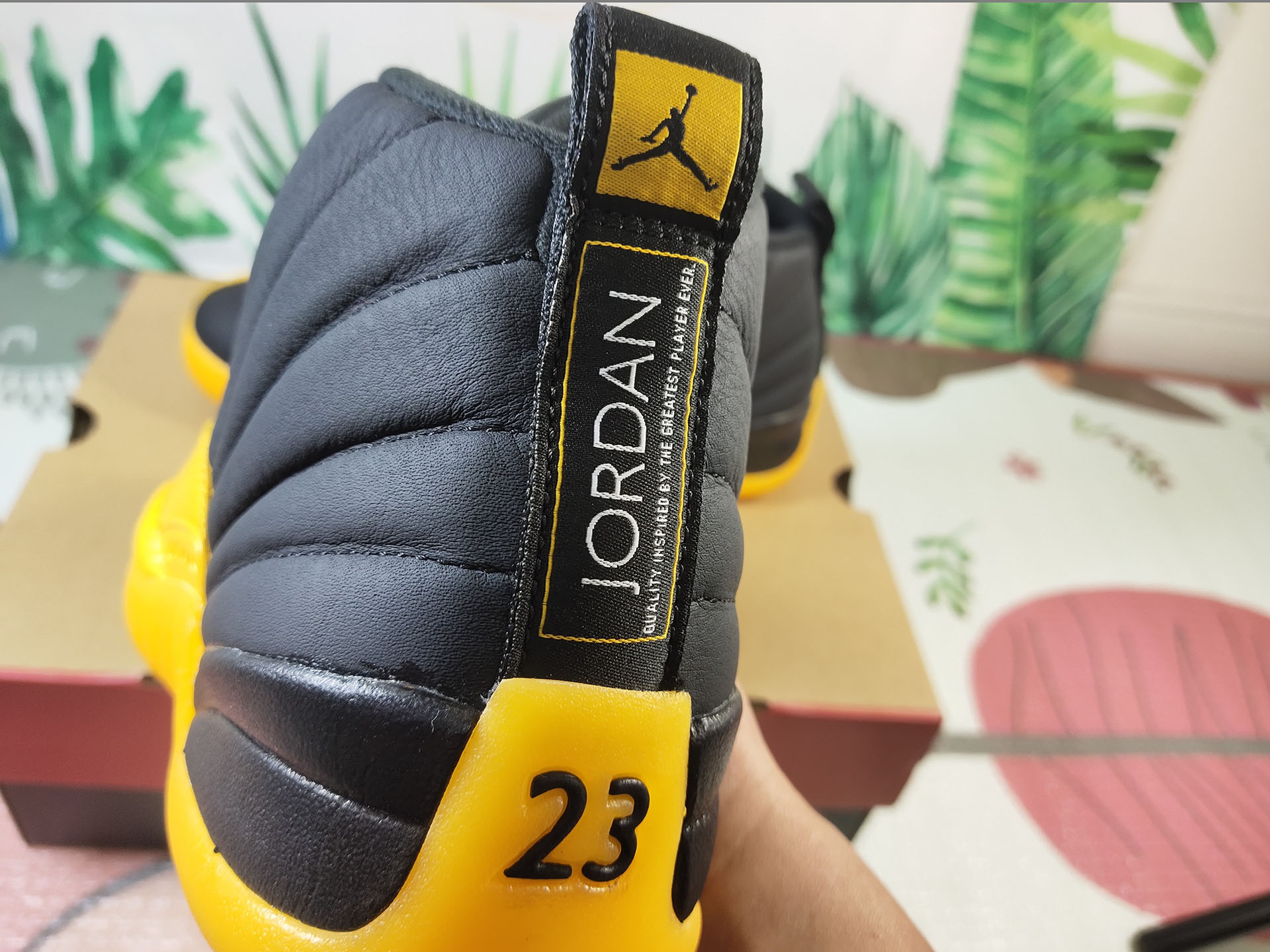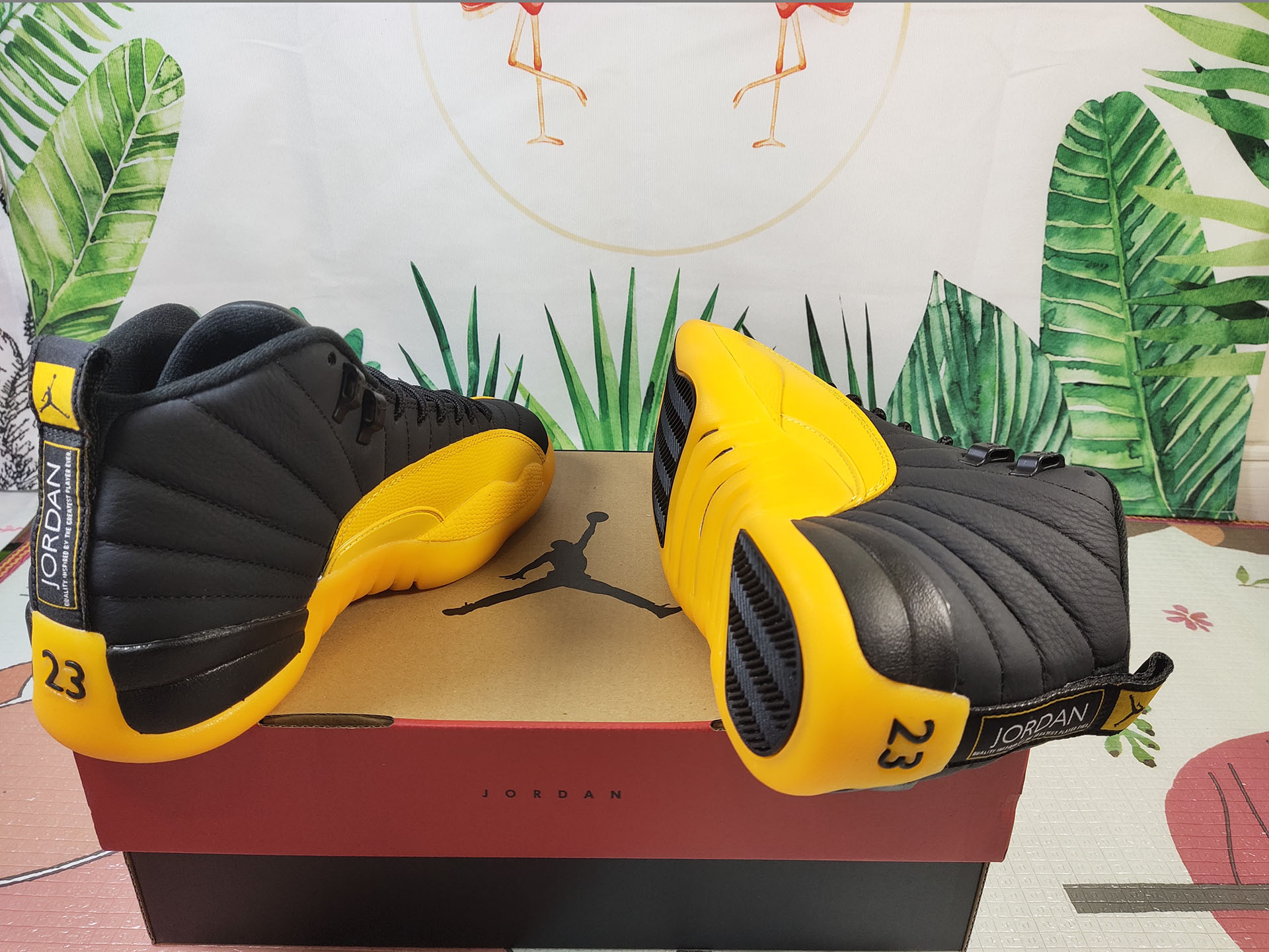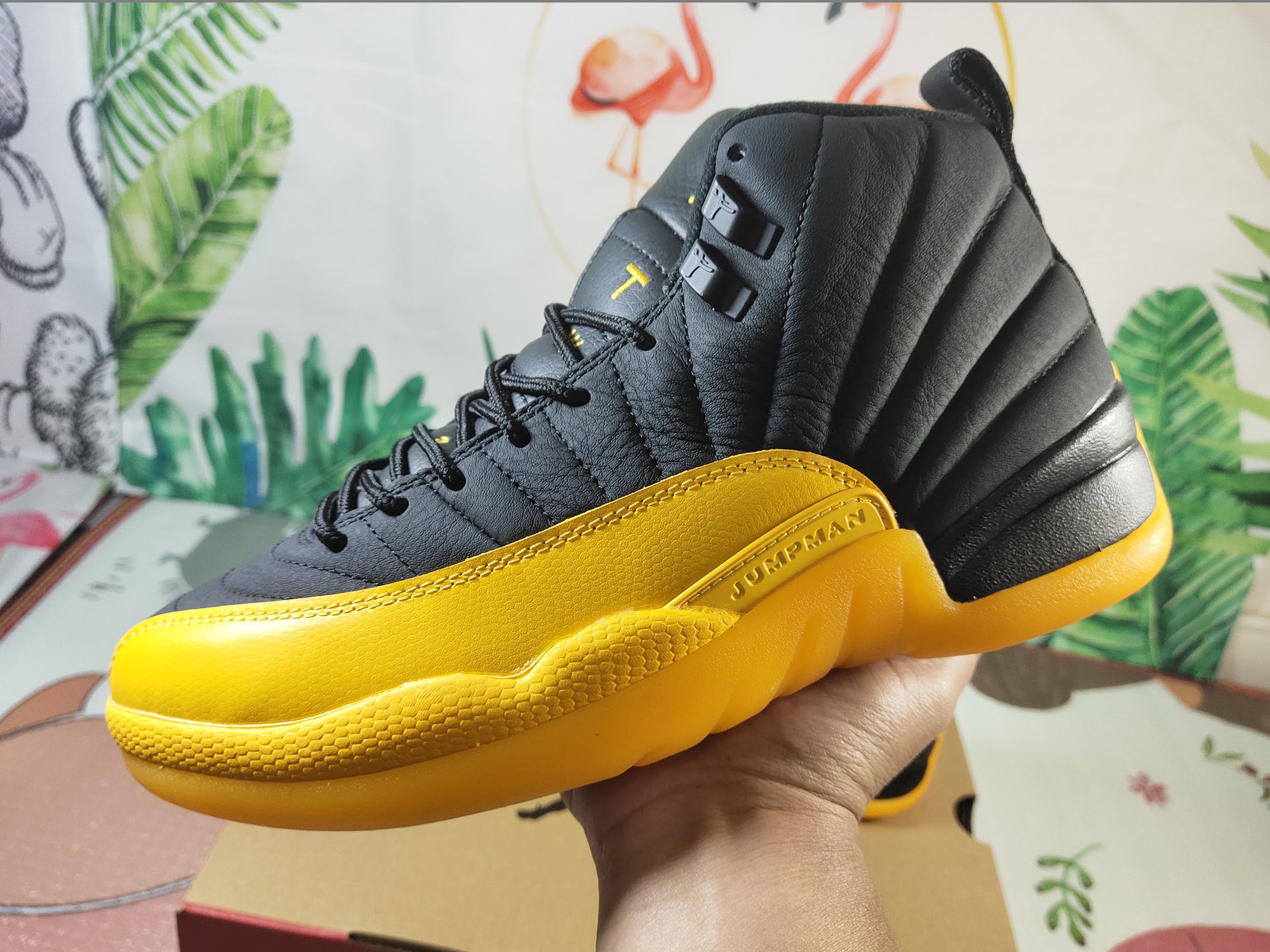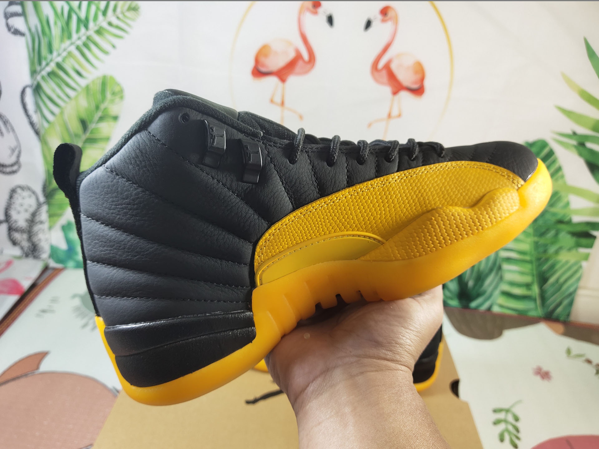 The retro mid-stop sports a black tumbled leather upper with signature stitch detailing, contrasted by a University Gold finish on the textured forefoot overlays, rubber outsole and branding elements.