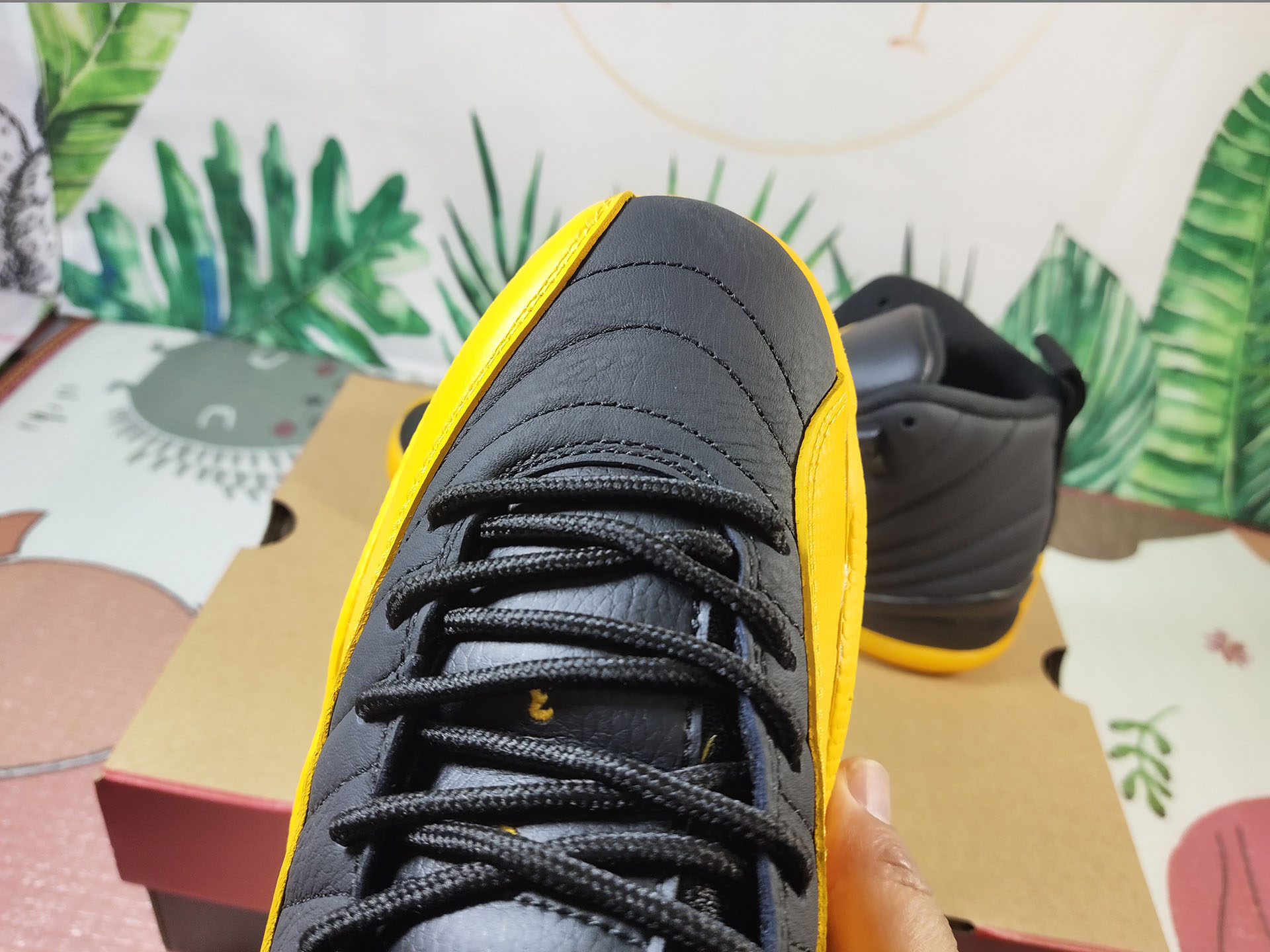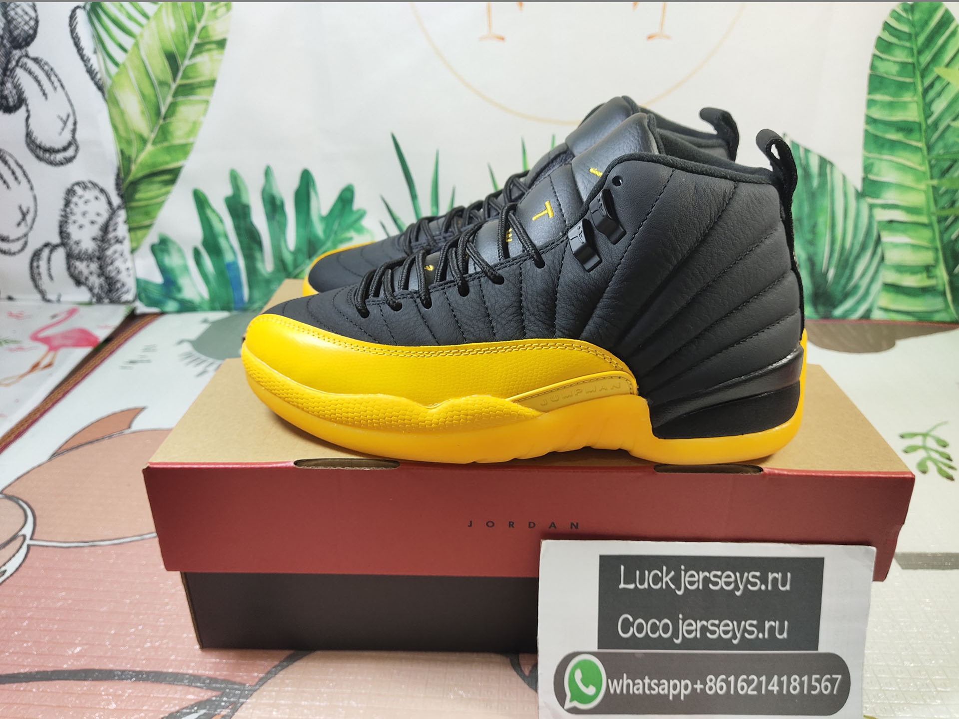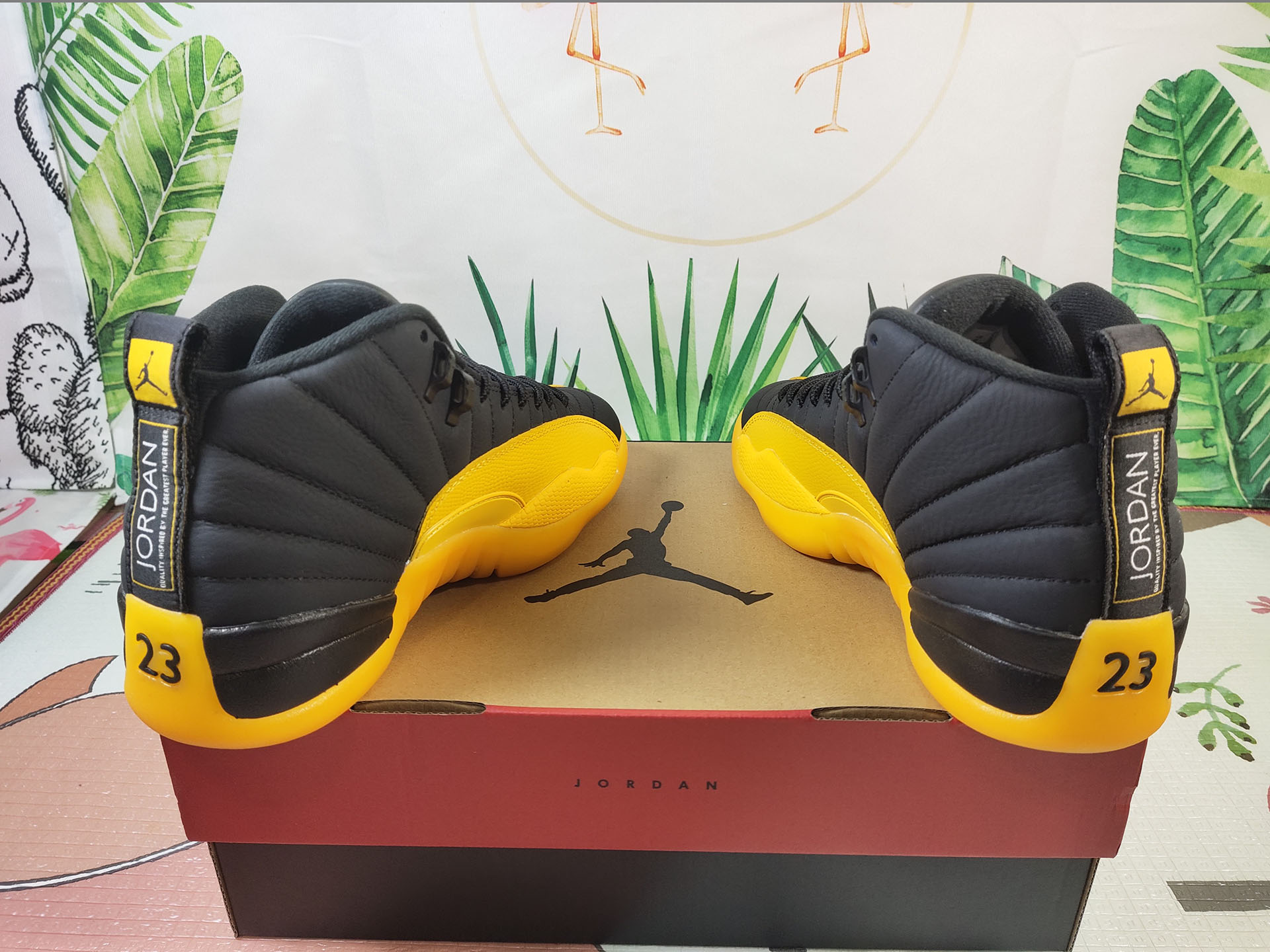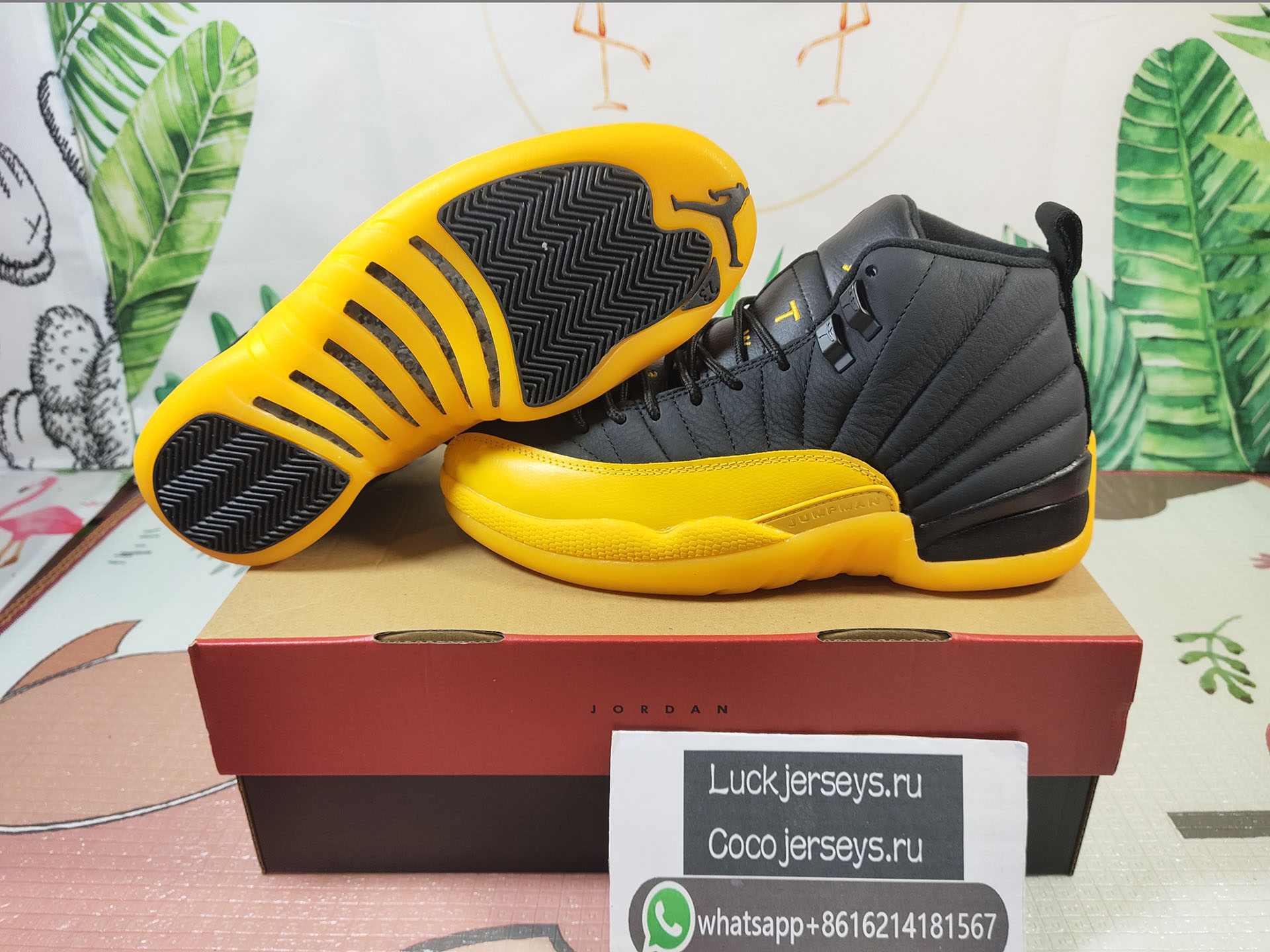The retro mid-stop sports a black tumbled leather upper with signature stitch detailing, contrasted by a University Gold finish on the textured forefoot overlays, rubber outsole and branding elements.