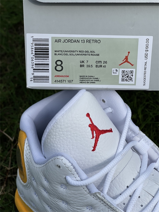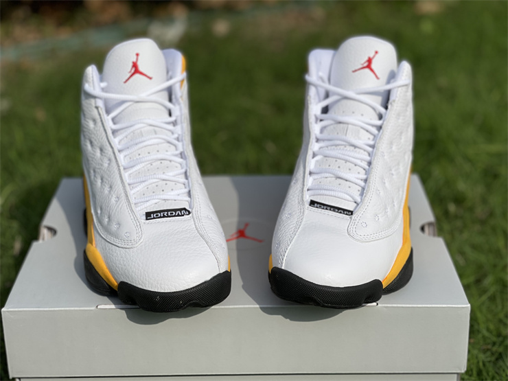 This Air Jordan 13 features White leather on the panels, toe, and tongues with a matching liner.